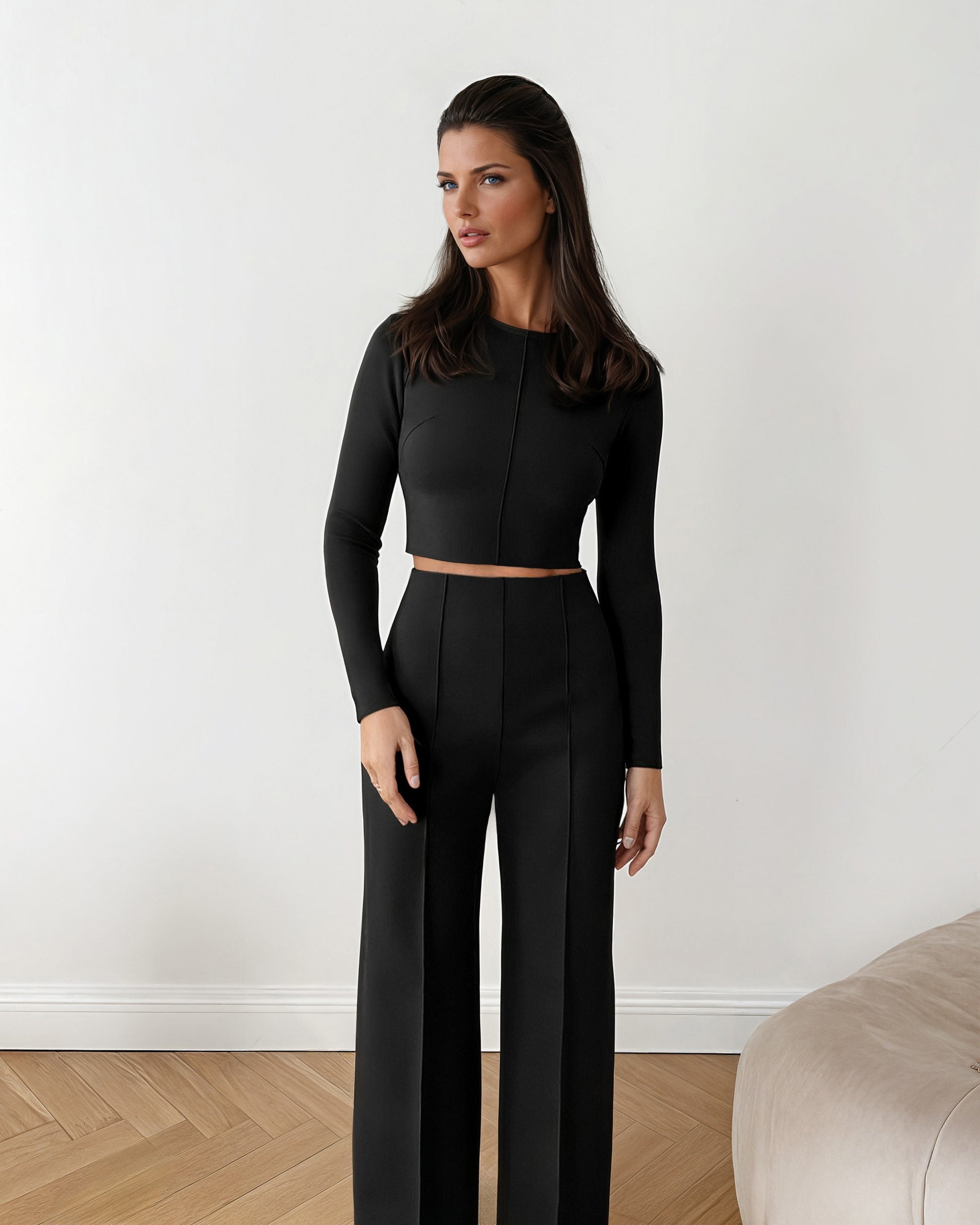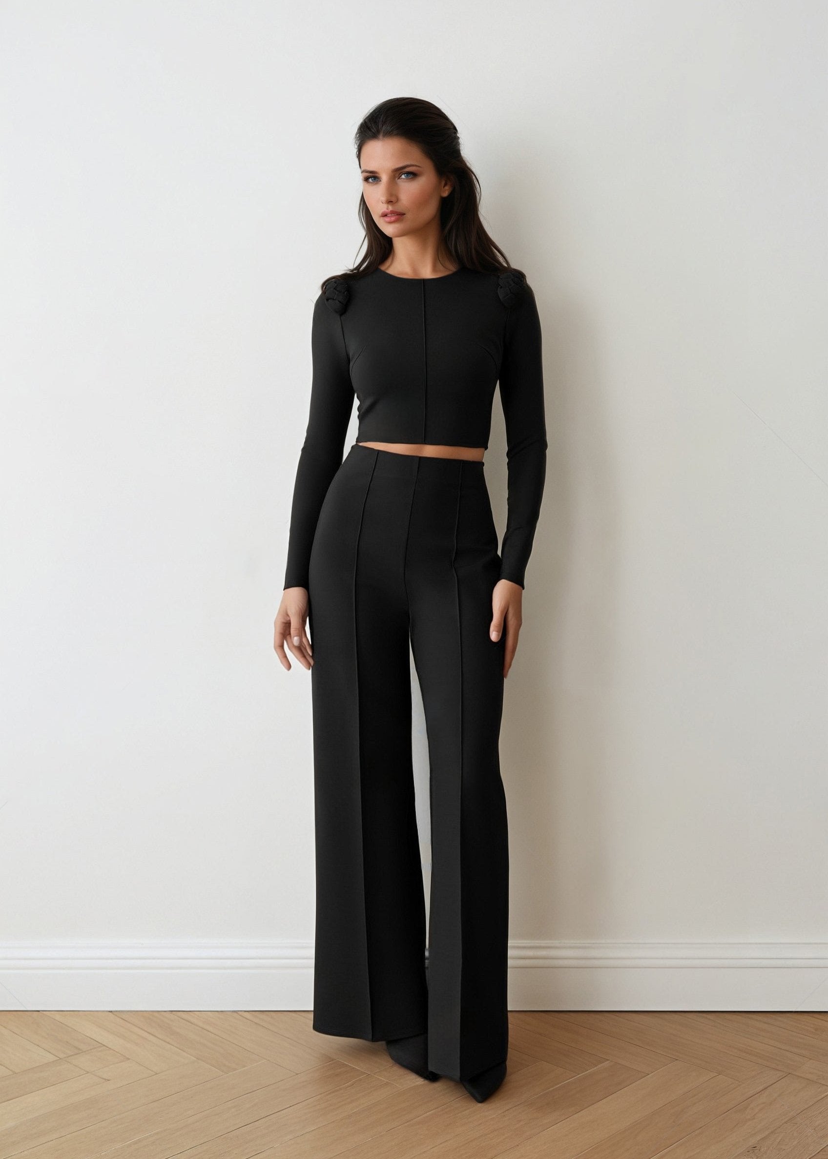 Костюм з щільного трикотажу - поєднання витонченості й комфорту. Топ з незвичним елементом у вигляді косичок ручної роботи, класичний чорний колір та крій, що підкреслює жіночність. Однозначно маст-хев цього сезону!
