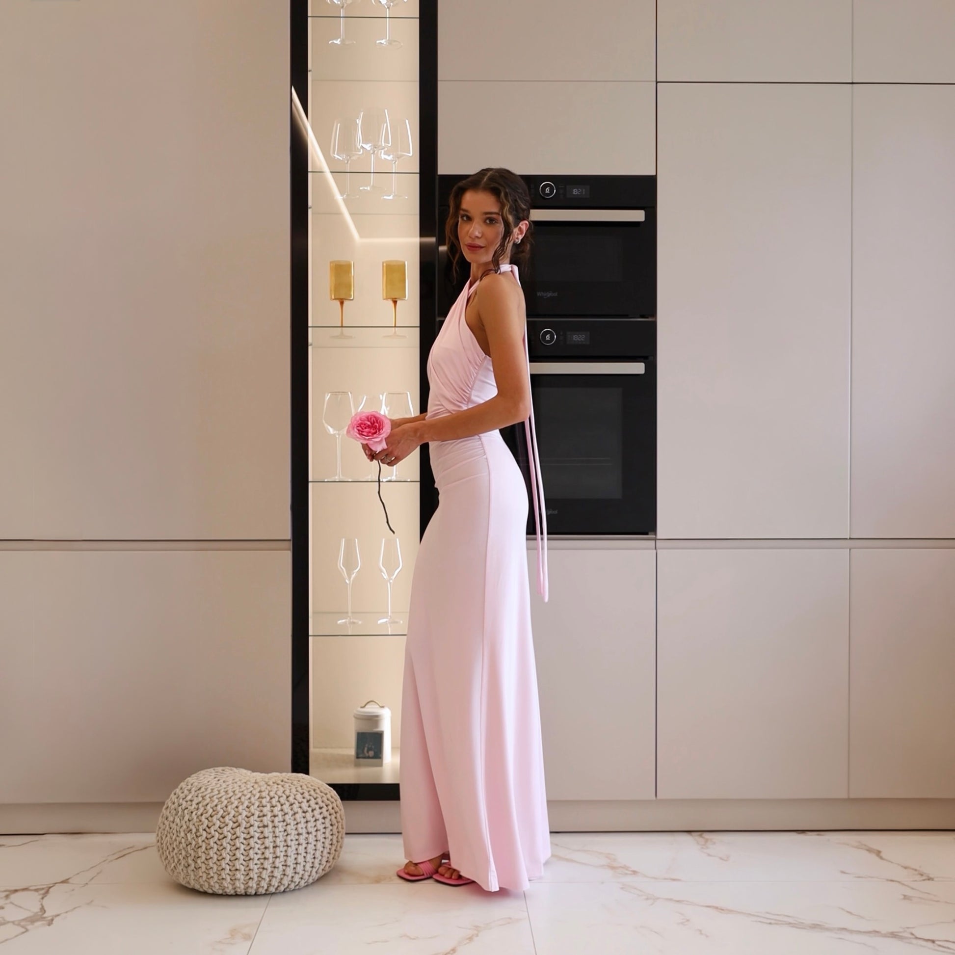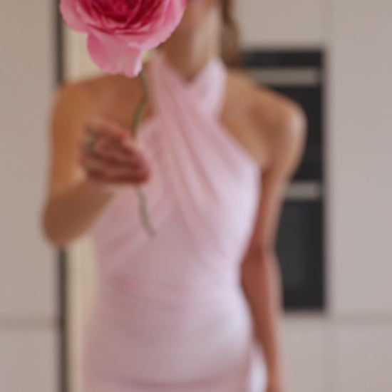 Сукня виготовлена з м'якого трикотажу, що забезпечує комфорт і легкість рухів. Тканина приємна на дотик та ідеально сідає по фігурі завдяки драпіруванню. Один з найцікавіших аспектів цієї сукні — це пелюстки на грудях. Вони універсальні і можуть бути зав'язані кількома способами як показано на останньому фото.