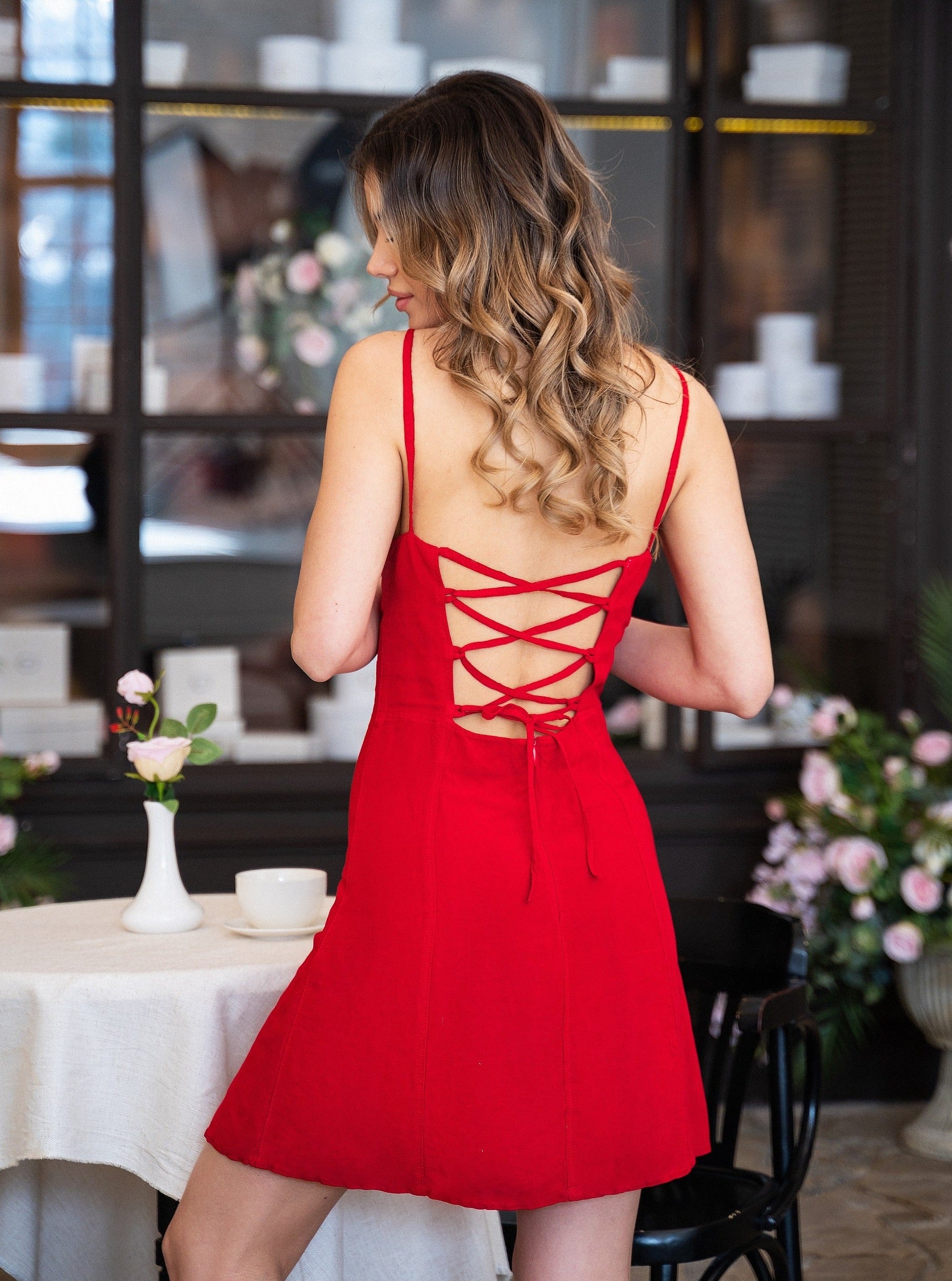 Ідеальна сукня на літо! Льон дозволяє відчувати себе комфортно навіть у найспекотніший день, бретелі та шнурівка ззаду регулюються під фігуру для вашої зручності.