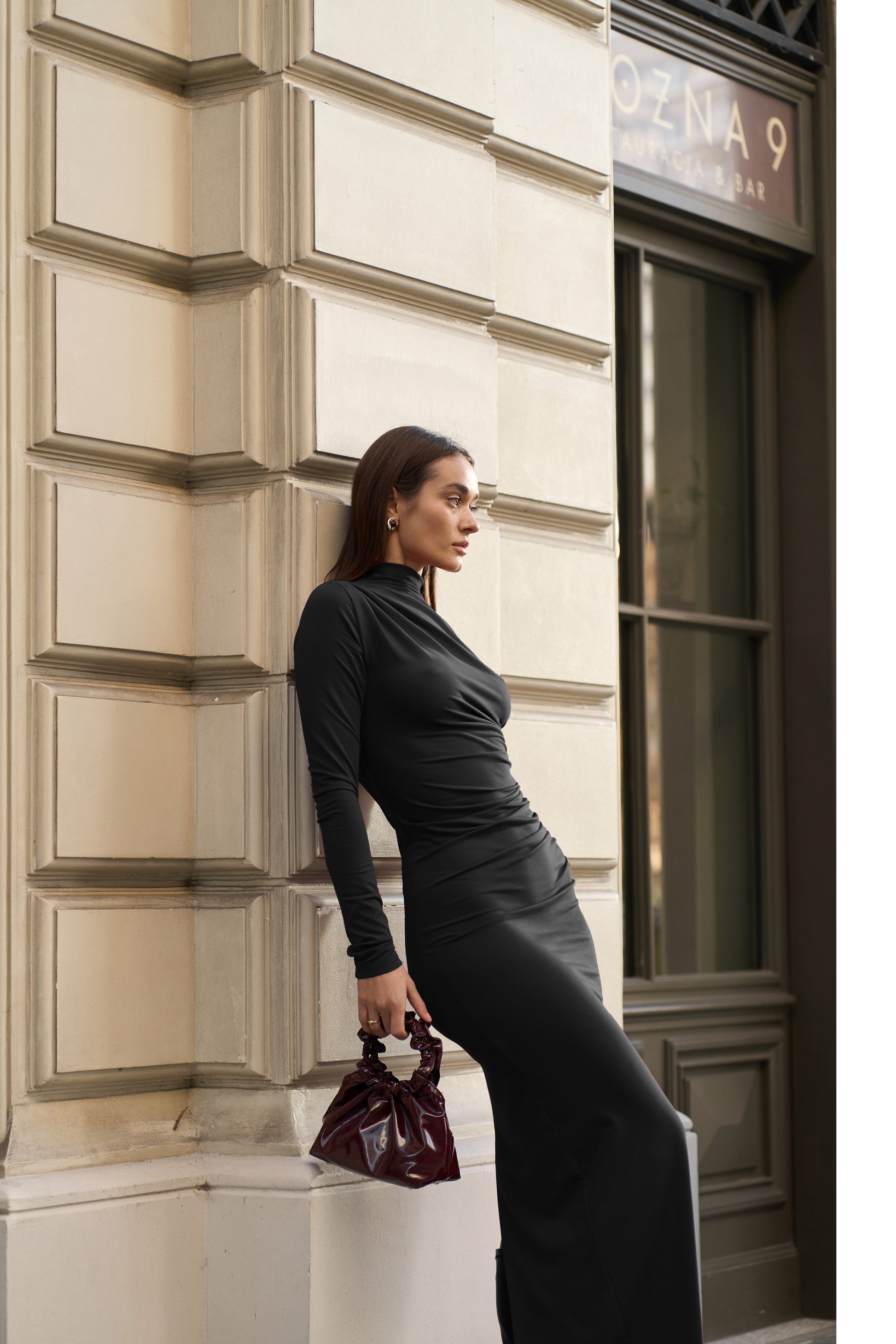 Елегантна сукня максі з довгими рукавами і завуженою до низу спідницею, виконана з еластичного гладенького трикотажу і доповнена безліччю дрібних драпірувань спереду, які ідеально підкреслюють фігуру та приховують недоліки.