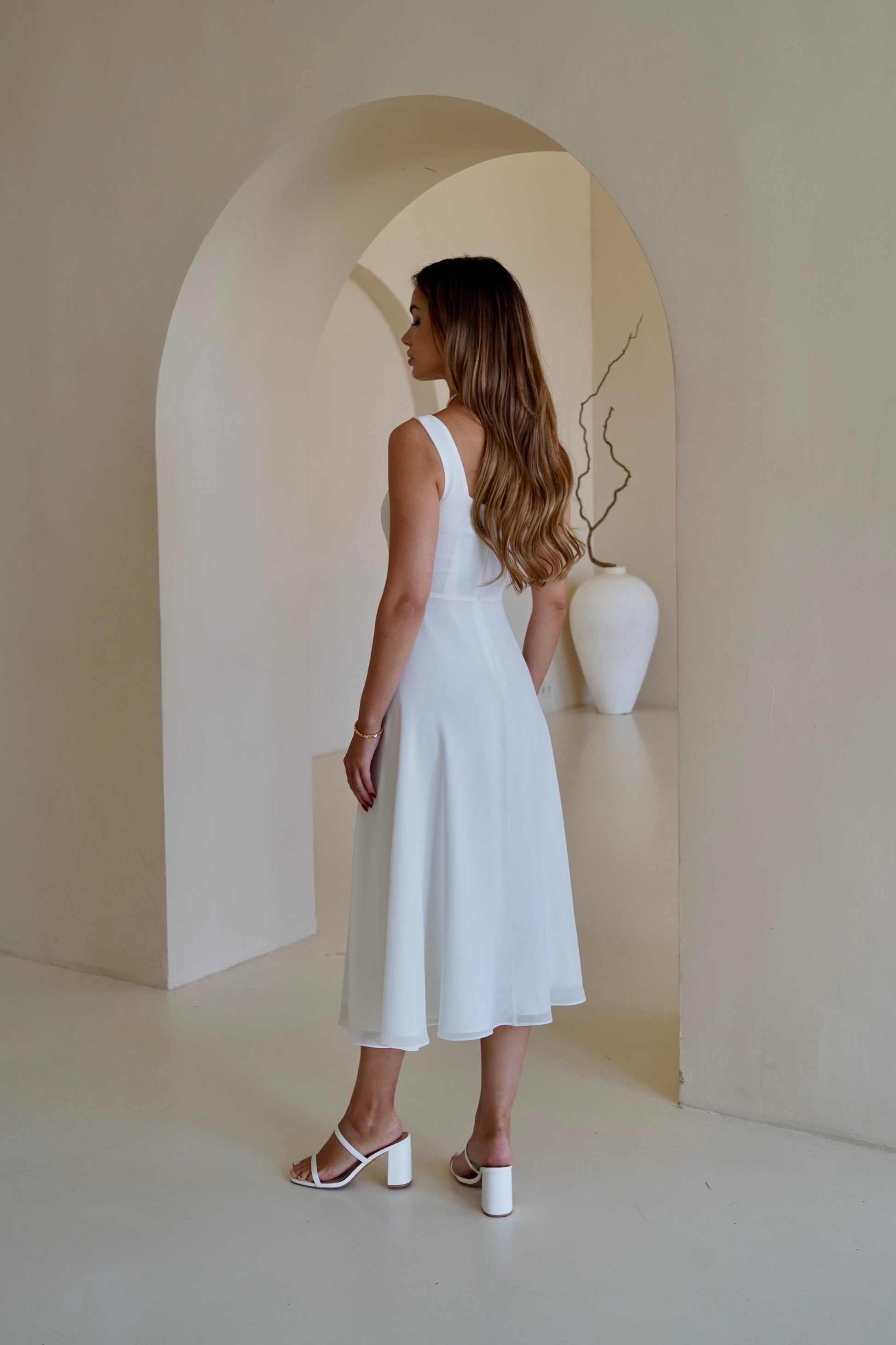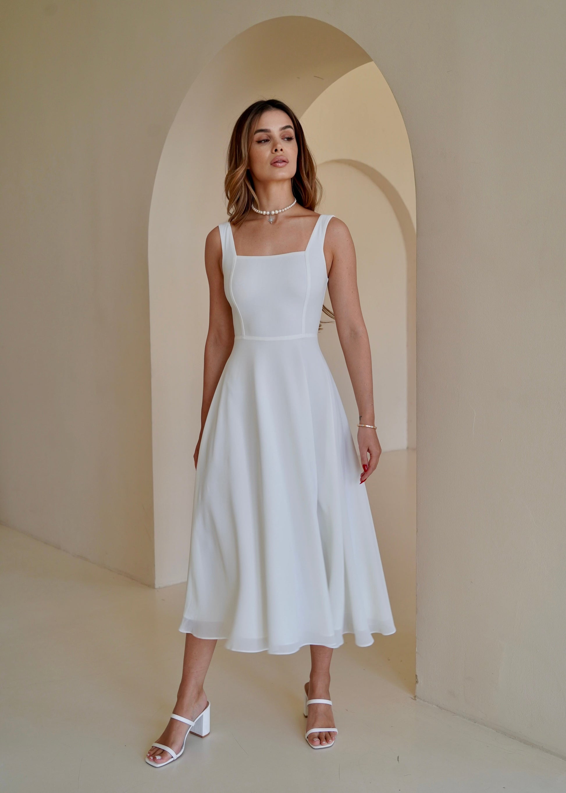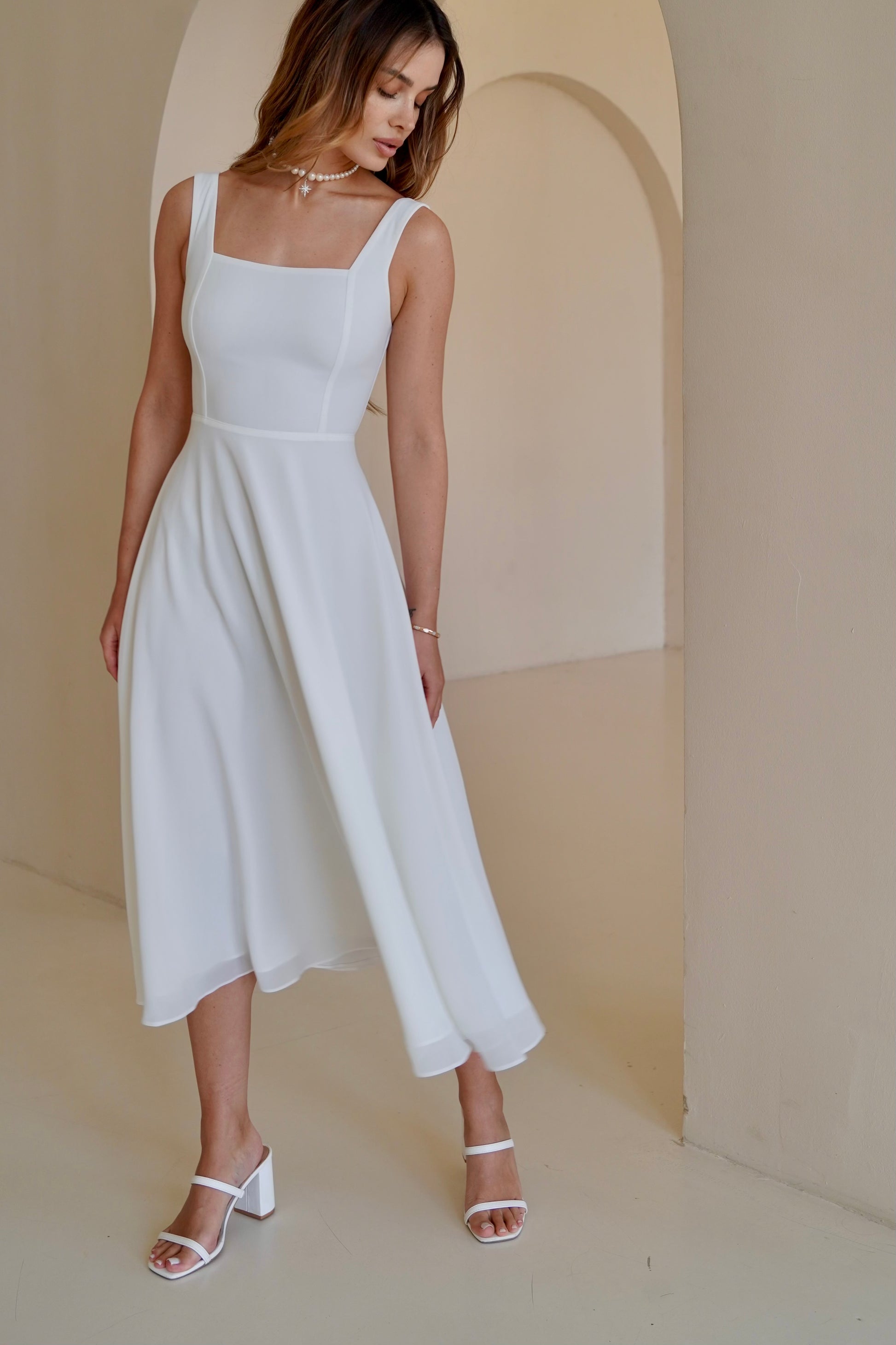 Ніжна шифонова сукня довжини міді з широкими бретелями — класичний варіант для літнього гардеробу. Вертикальні виточки та відрізна талія підкреслюють вашу фігуру, а легкий матеріал дарує відчуття свободи. Відчуйте легкість літа в кожному кроці! Тканина має мінімальну зминаємість, тому подарує свіжий вигляд на весь день!
