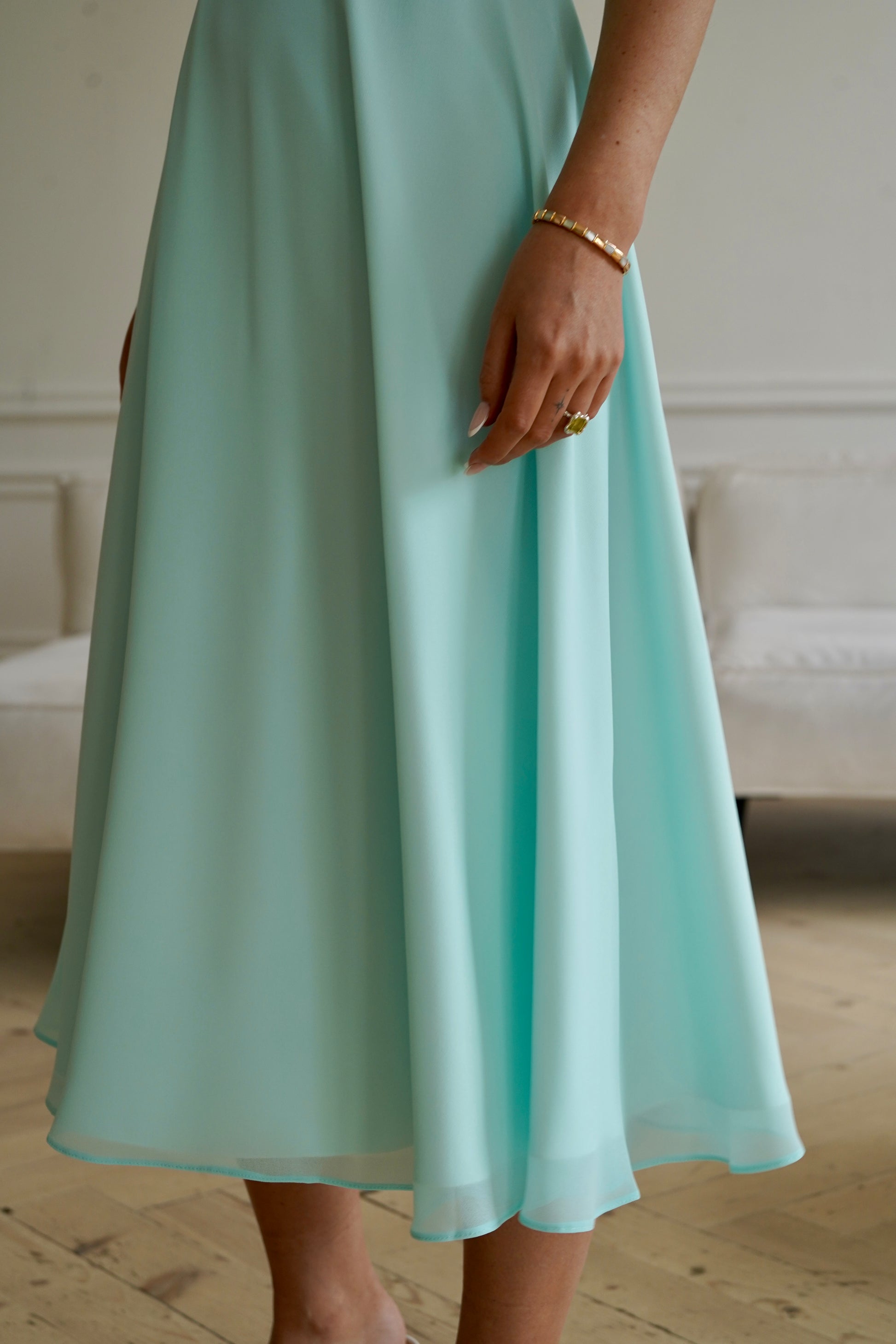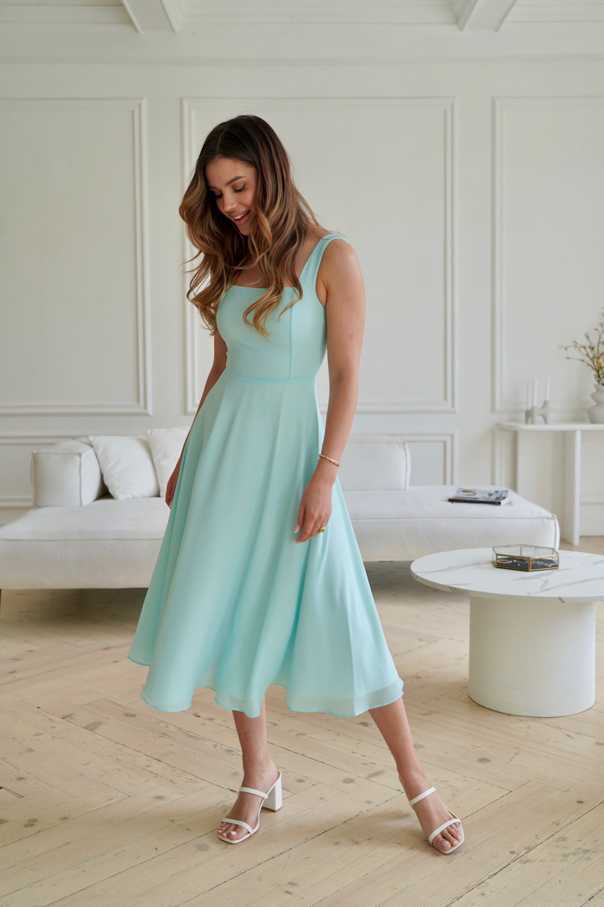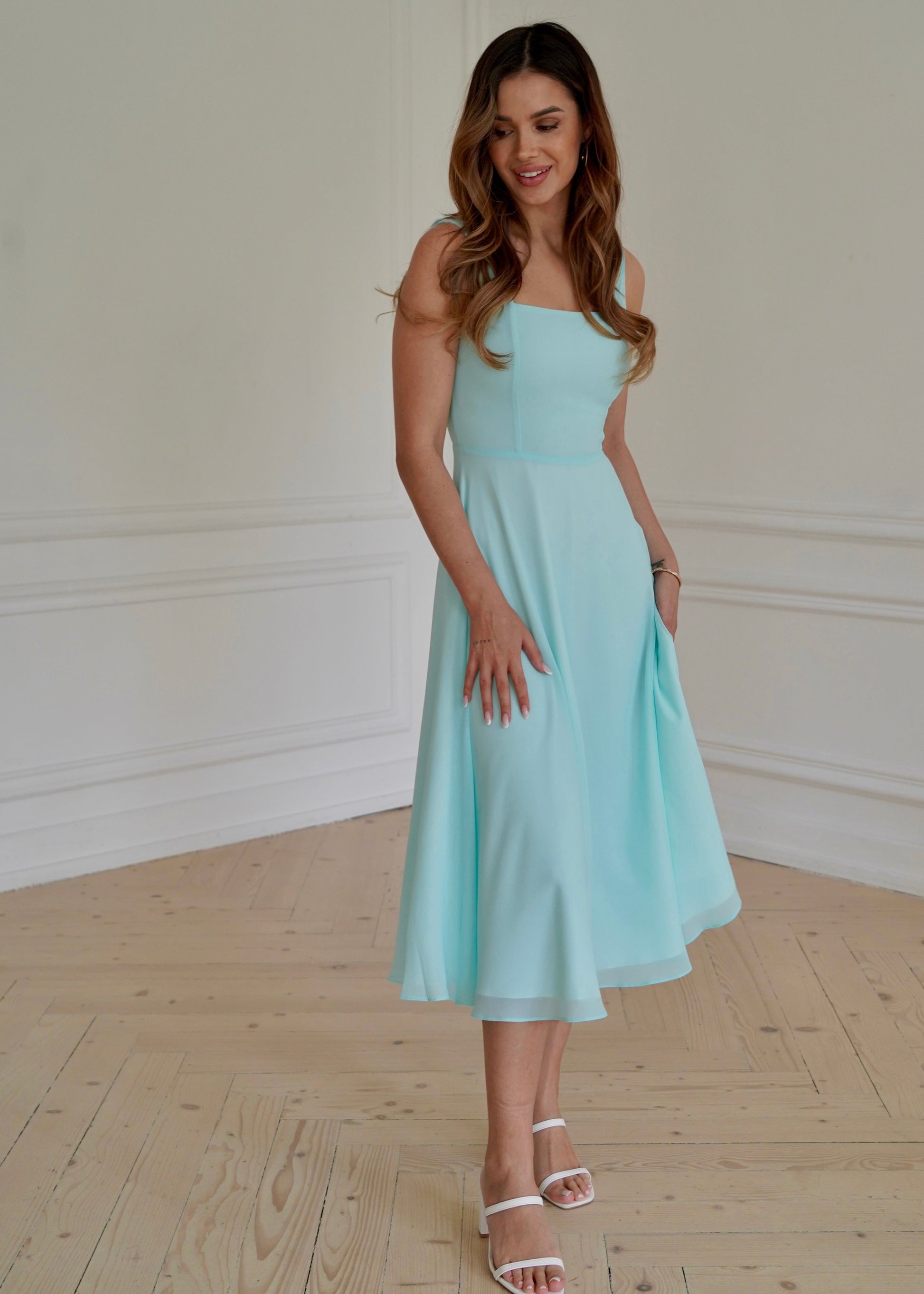 Ніжна шифонова сукня довжини міді з широкими бретелями — яскравий універсальний варіант для літнього святкового гардеробу. Вертикальні виточки та відрізна талія підкреслюють вашу фігуру, а легкий матеріал дарує відчуття свободи. Відчуйте легкість літа в кожному кроці! Тканина має мінімальну зминаємість, тому подарує свіжий вигляд на весь день!