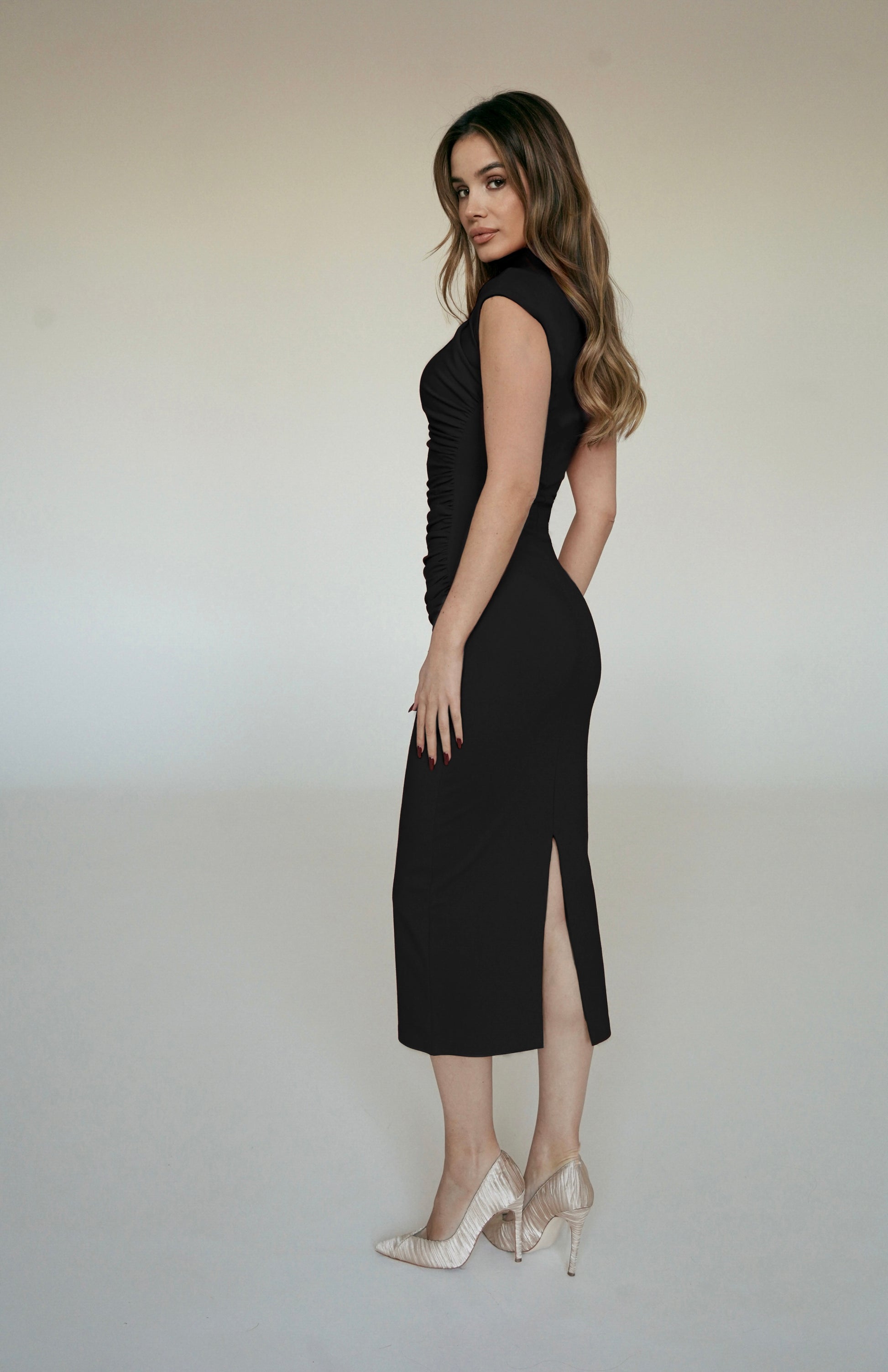 Елегантна сукня міді із завуженою до низу спідницею, виконана з еластичного гладенького трикотажу і доповнена безліччю дрібних драпірувань спереду, які ідеально підкреслюють фігуру та приховують недоліки.