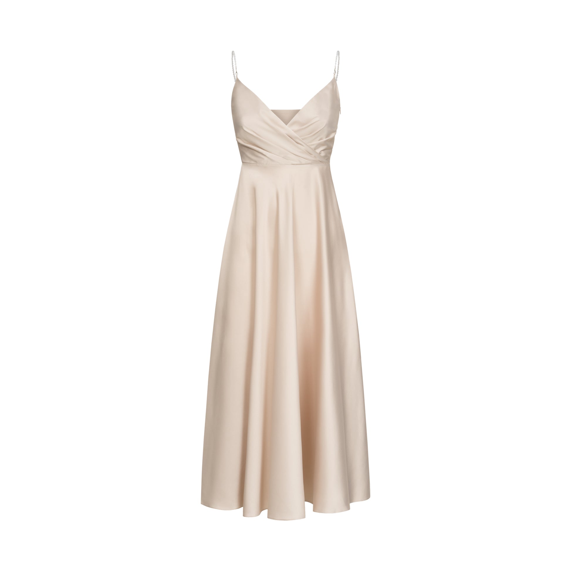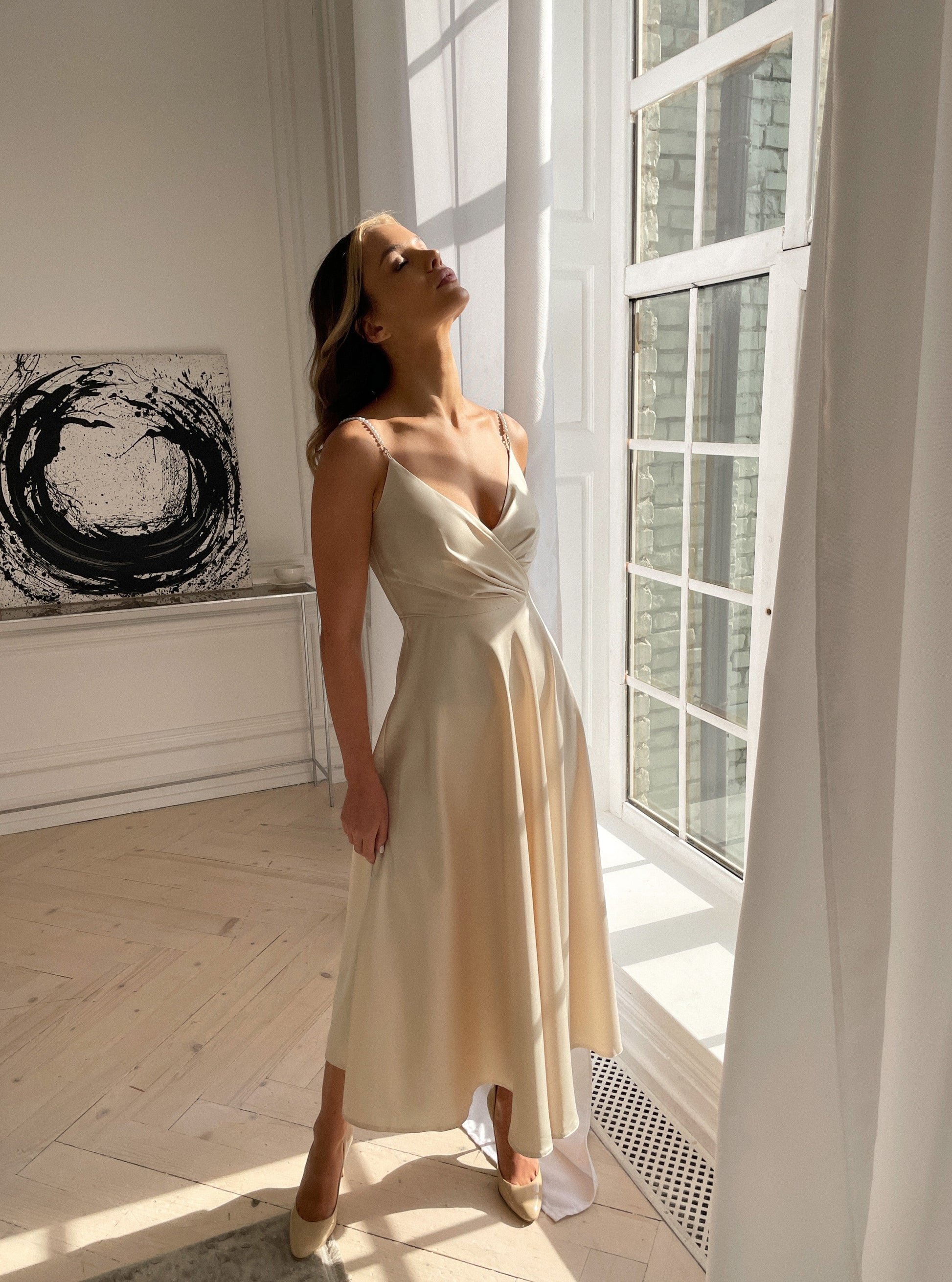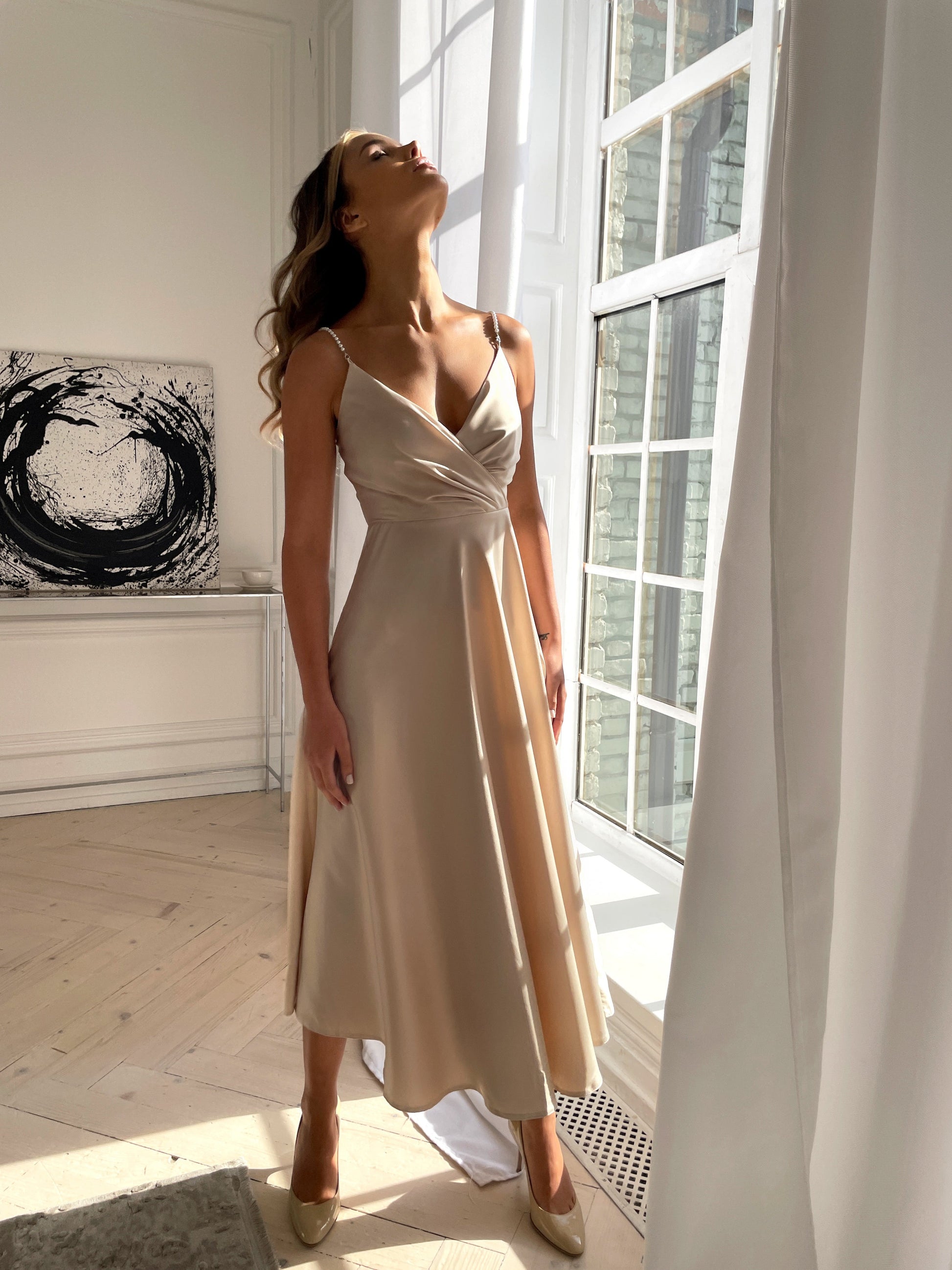 Наша найжіночніша та ніжна сукня. Незвичайний елемент у вигляді перлинних бретелей додає образу вишуканості та завершеності, не вимагаючи багато додаткових аксесуарів.