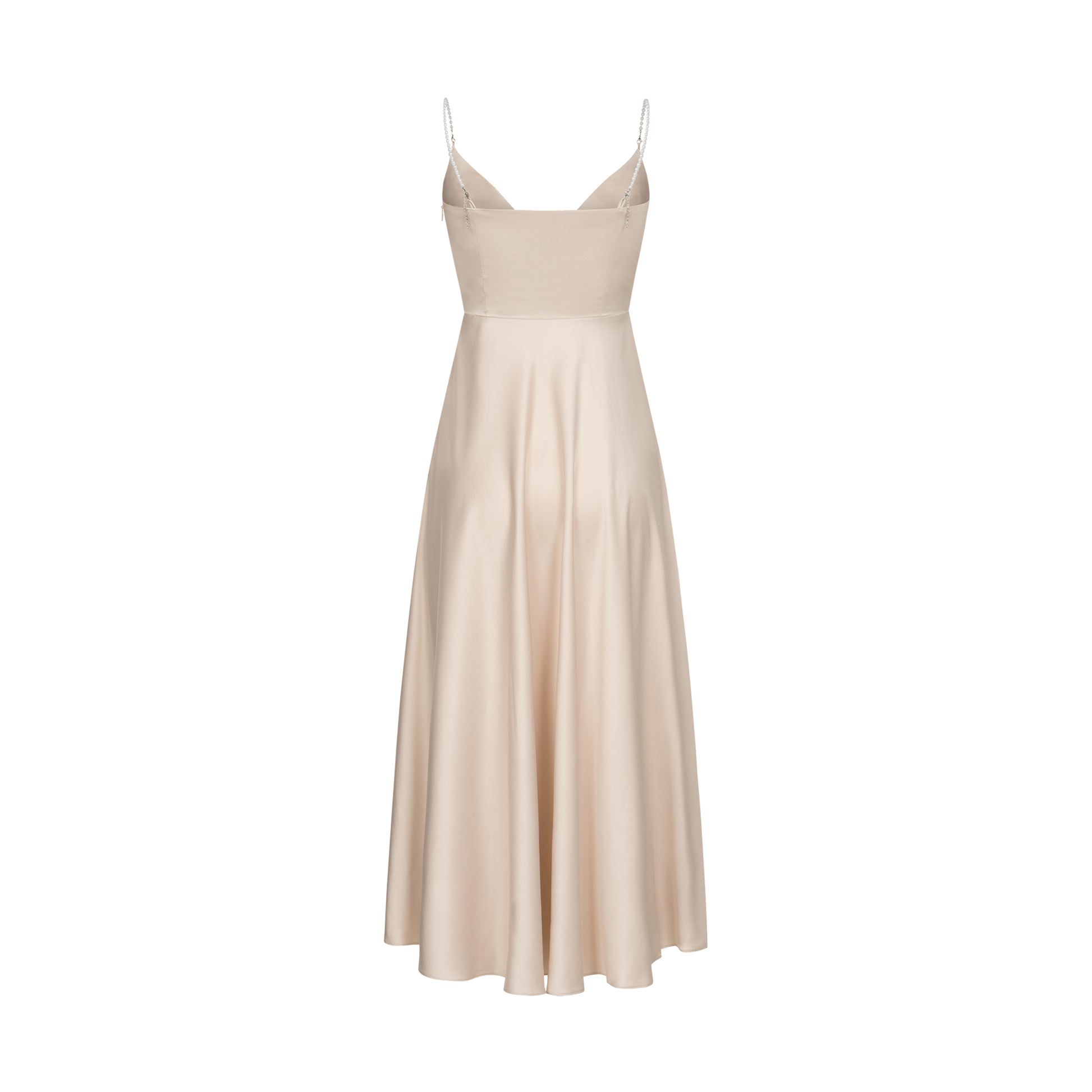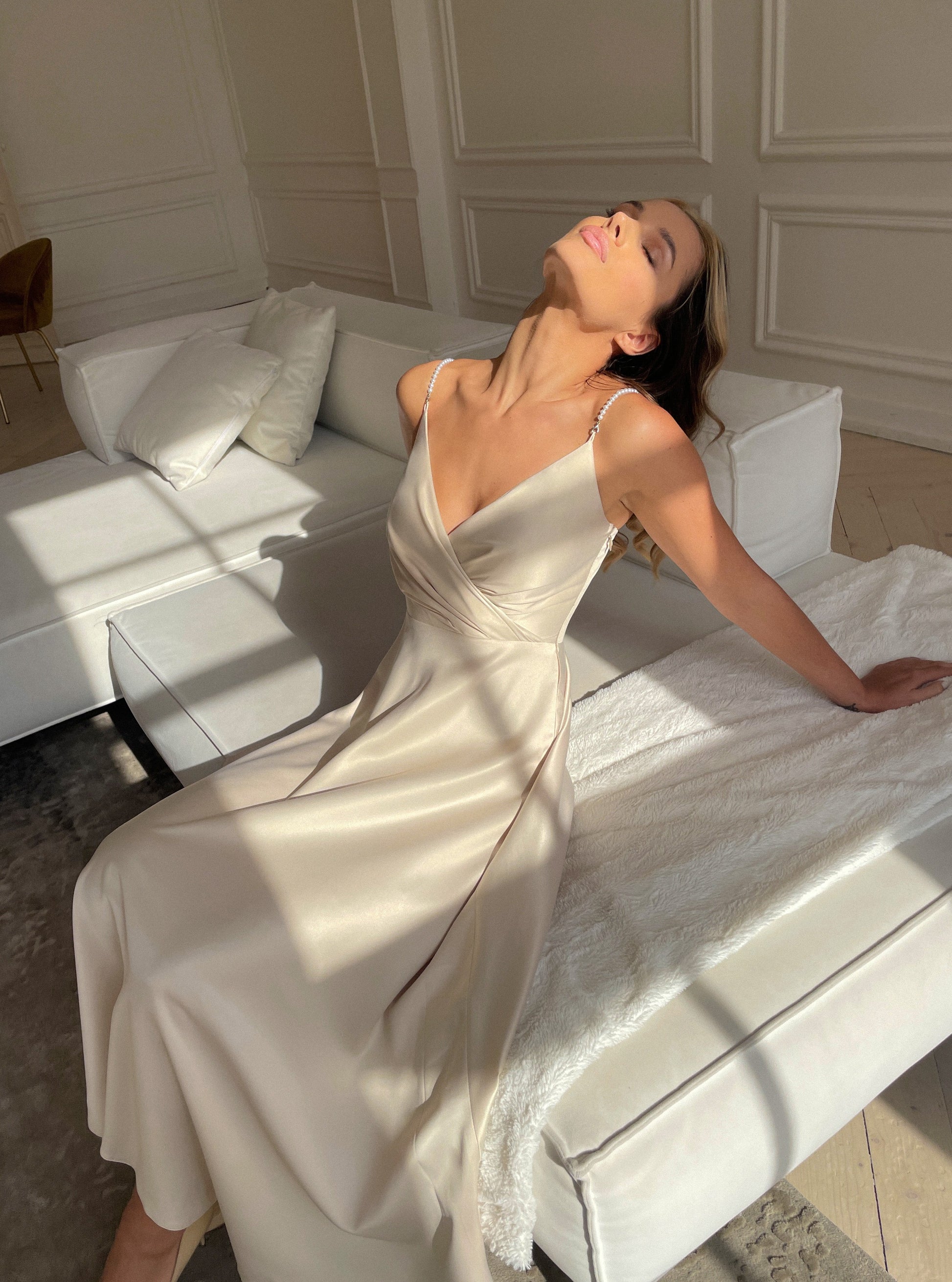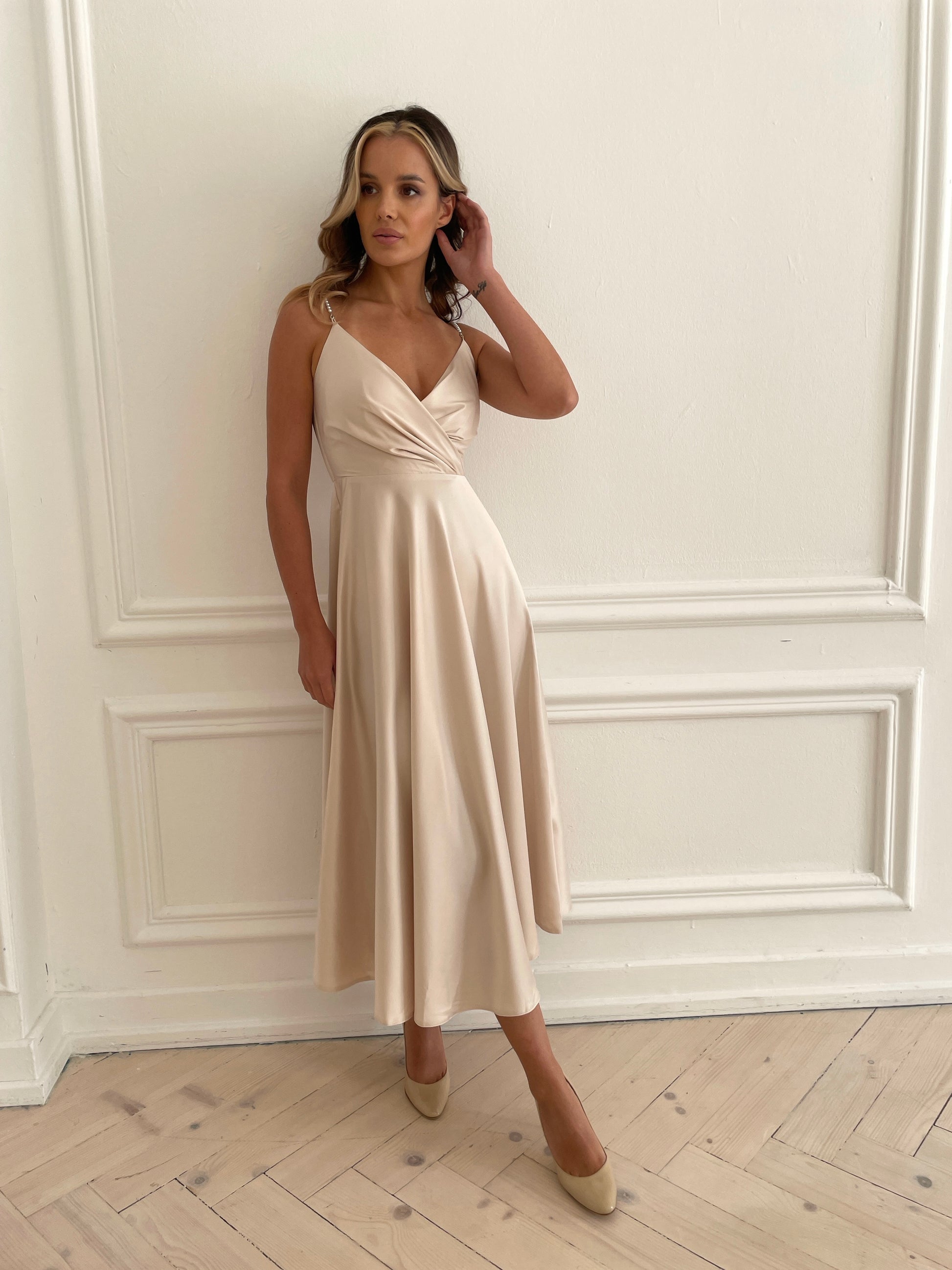 Наша найжіночніша та ніжна сукня. Незвичайний елемент у вигляді перлинних бретелей додає образу вишуканості та завершеності, не вимагаючи багато додаткових аксесуарів.