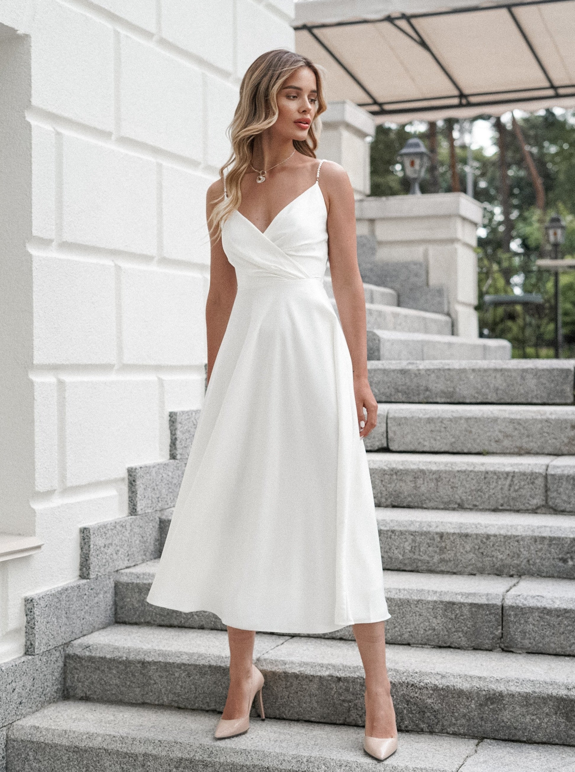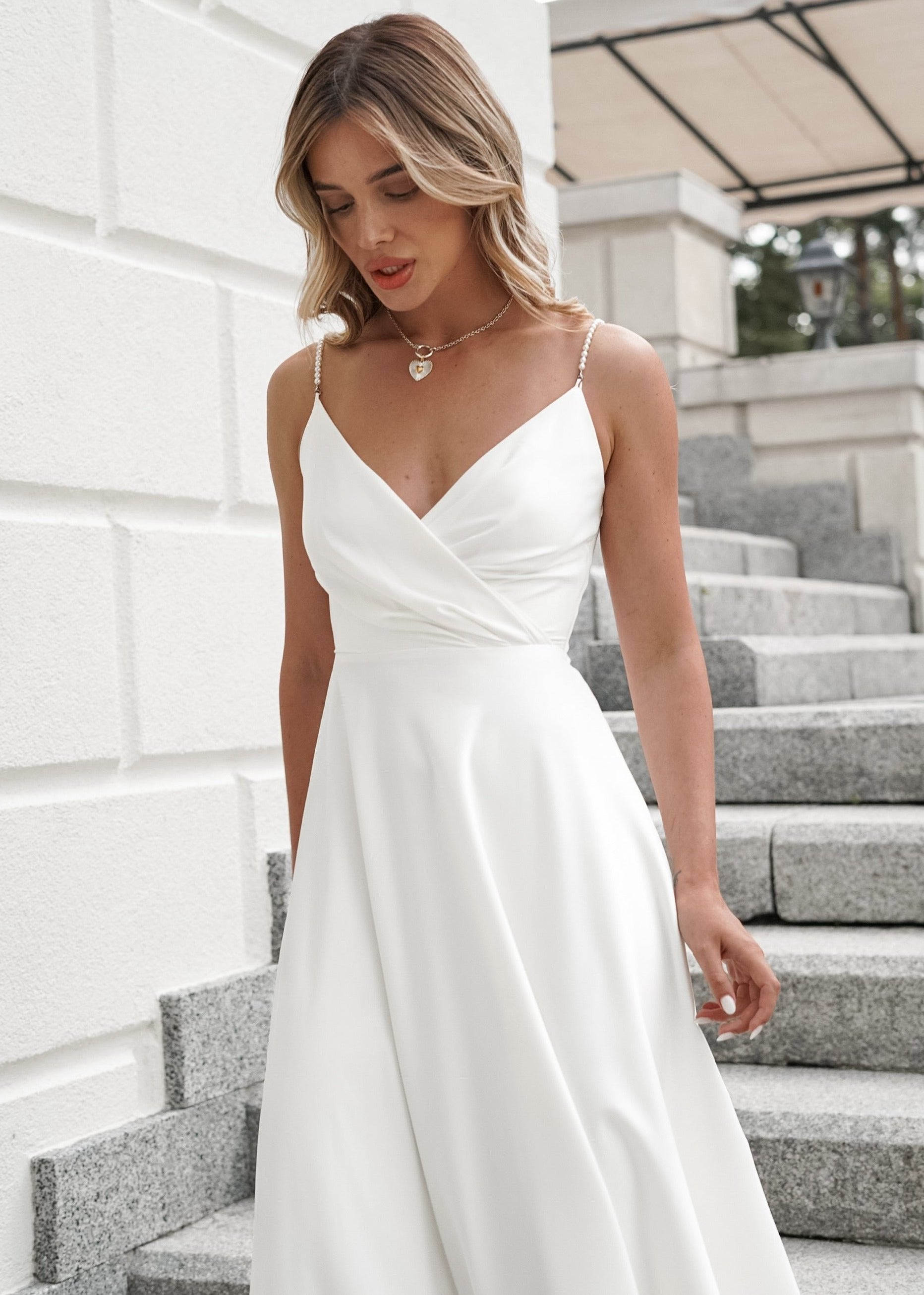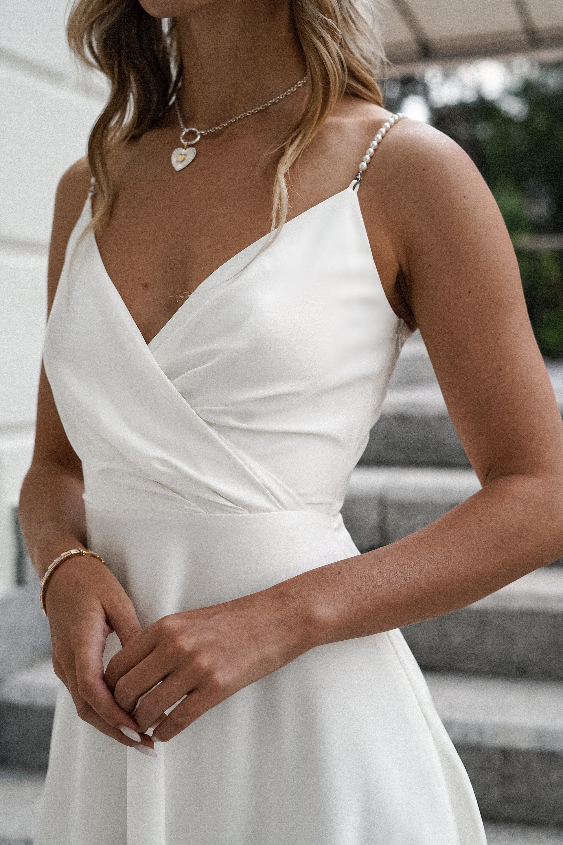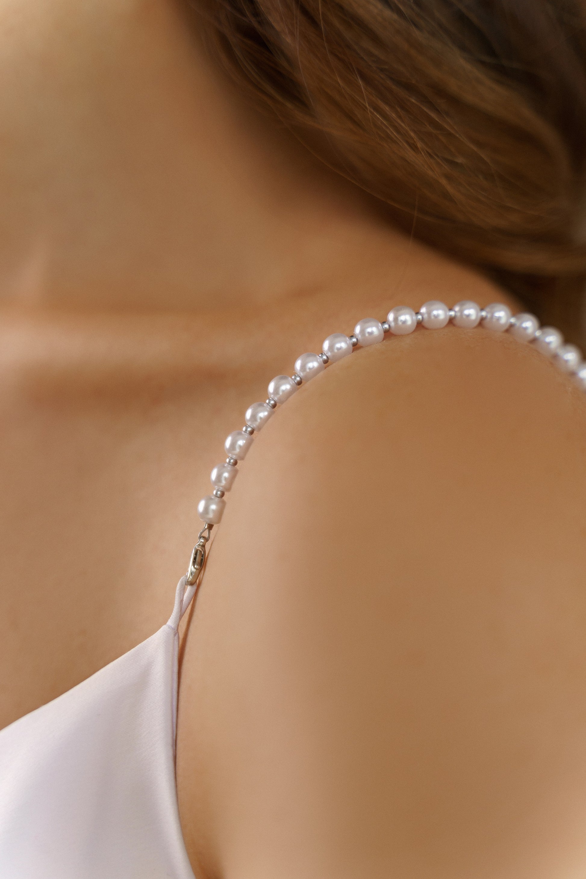 Наша найжіночніша та ніжна сукня. Незвичайний елемент у вигляді перлинних бретелей додає образу вишуканості та завершеності, не вимагаючи багато додаткових аксесуарів.