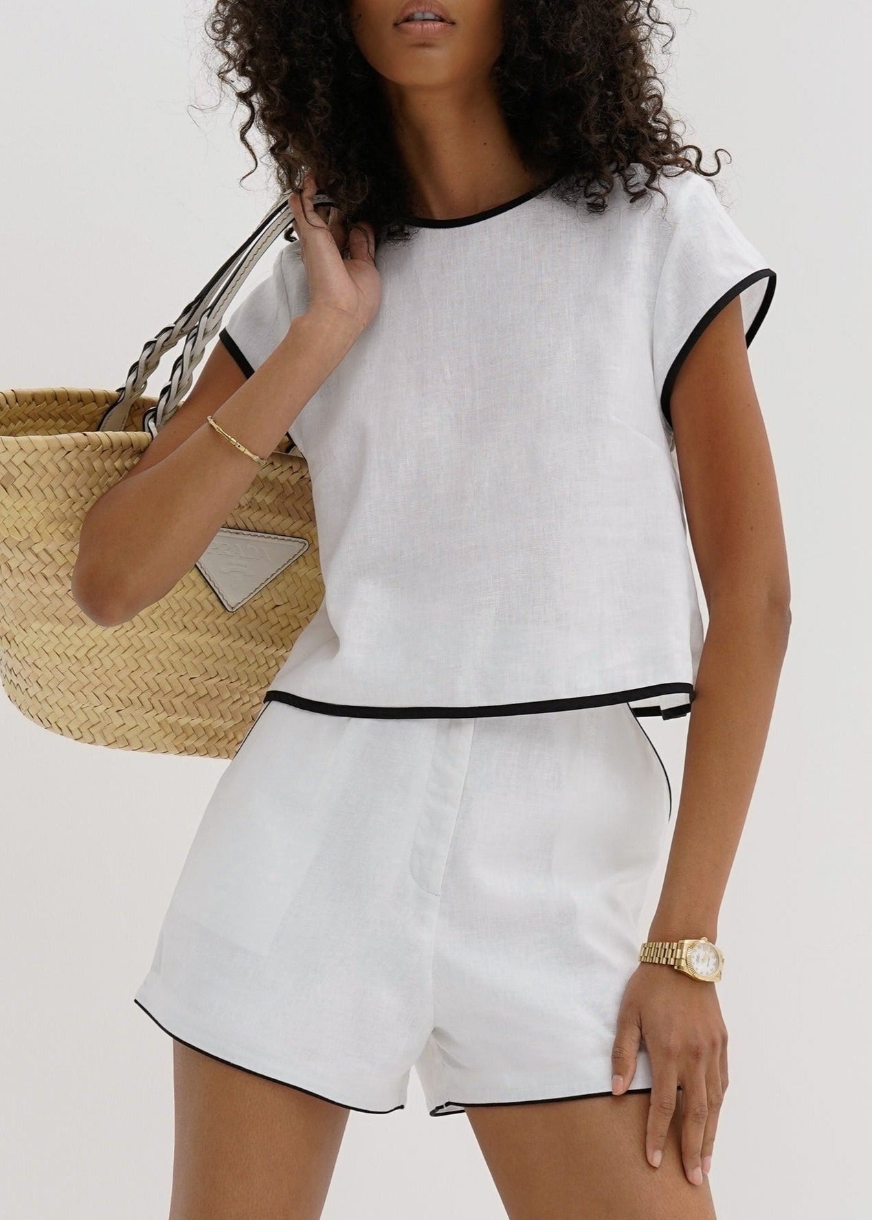 - Матеріал: 100% льон, виробництва Іспанія; бавовняний підклад на шортах