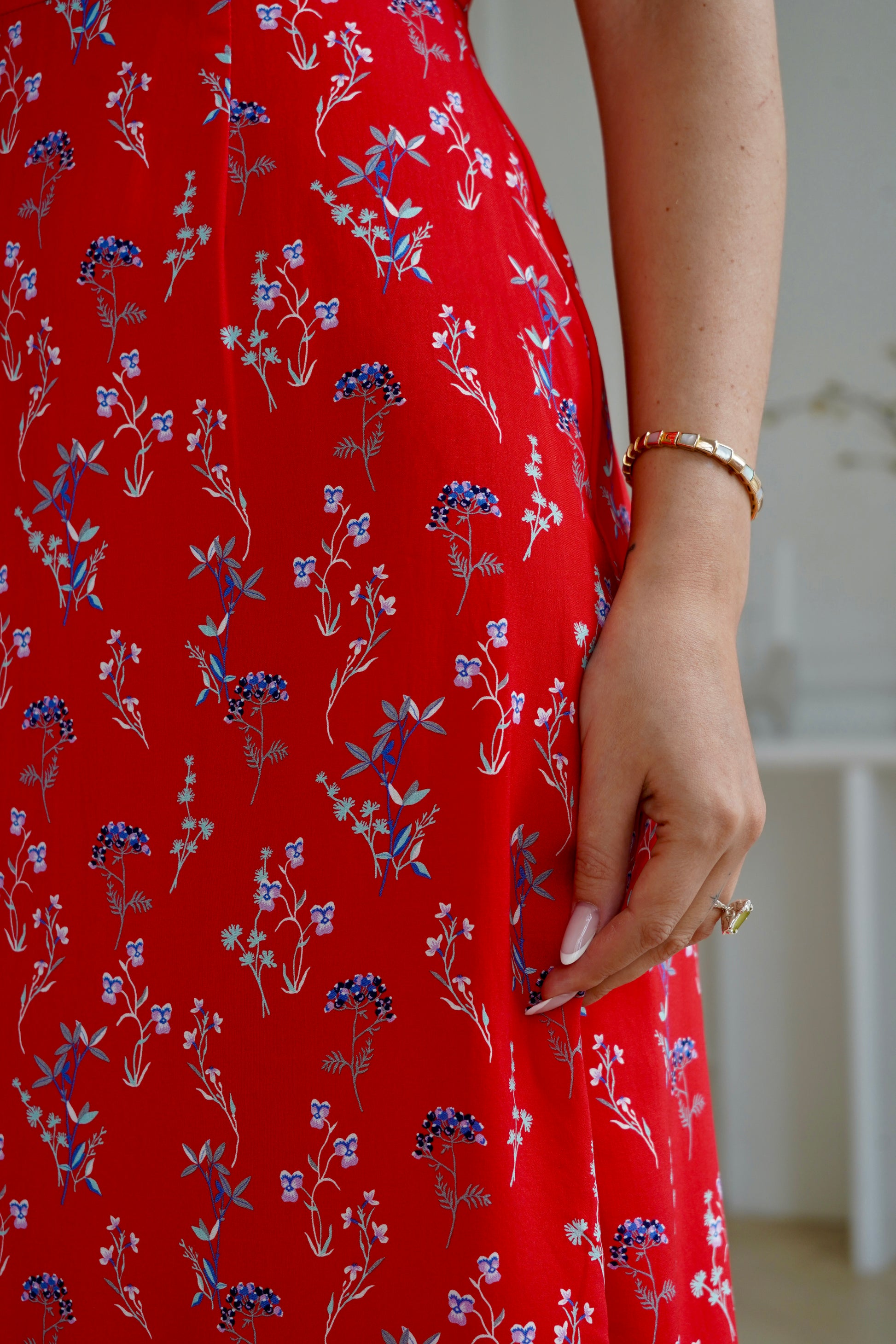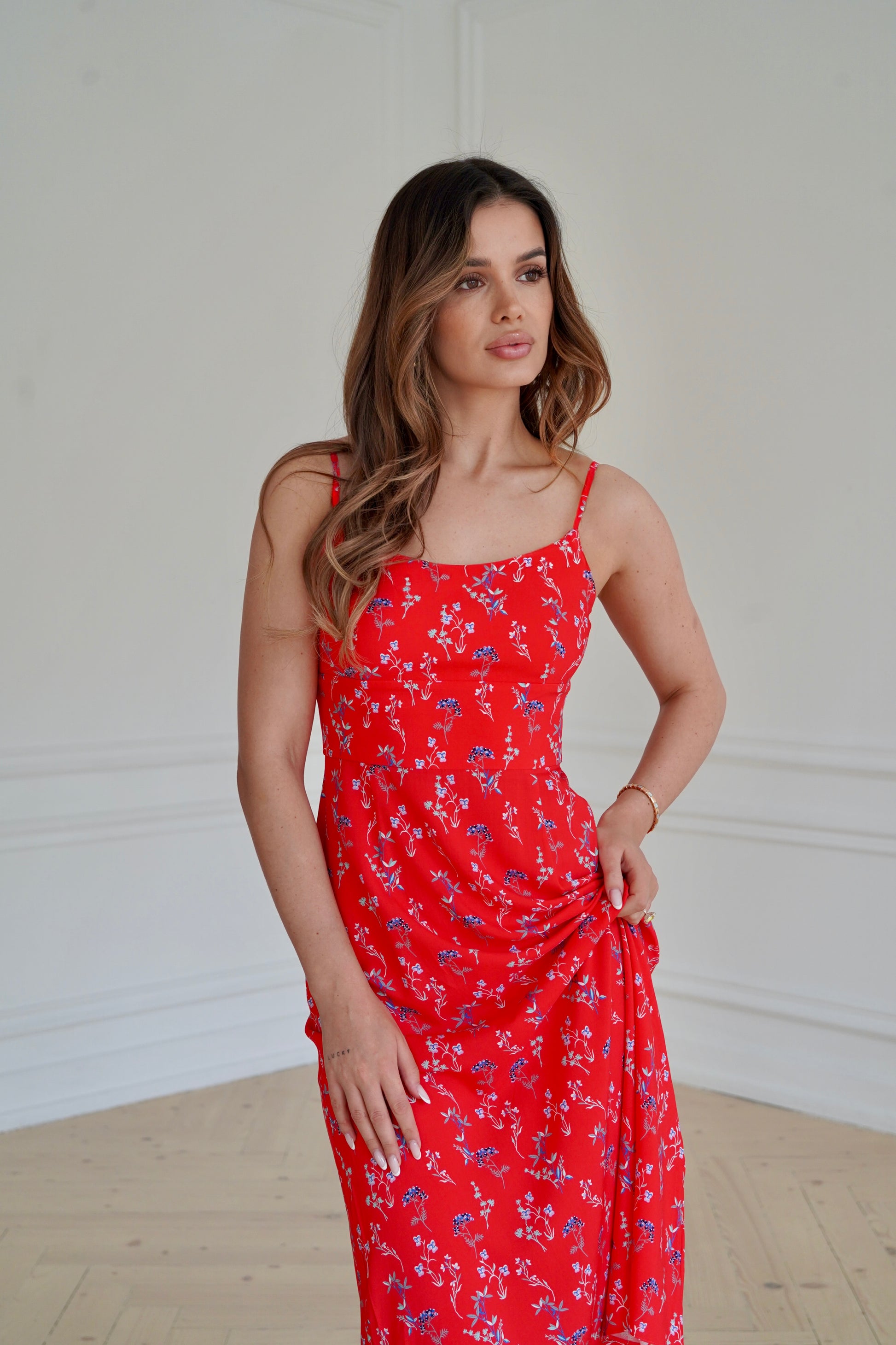 Легка, повітряна сукня, виготовлена зі 100% італійської віскози, що забезпечує комфорт у спекотні дні. Квітковий принт надає сукні жіночності, підкреслюючи вашу романтичну натуру. Довжина міді робить її універсальною, що дозволяє вдягати цю сукню на різні події — від святкових заходів до повсякденних зустрічей. Створіть неповторний образ, який залишить слід у пам'яті!