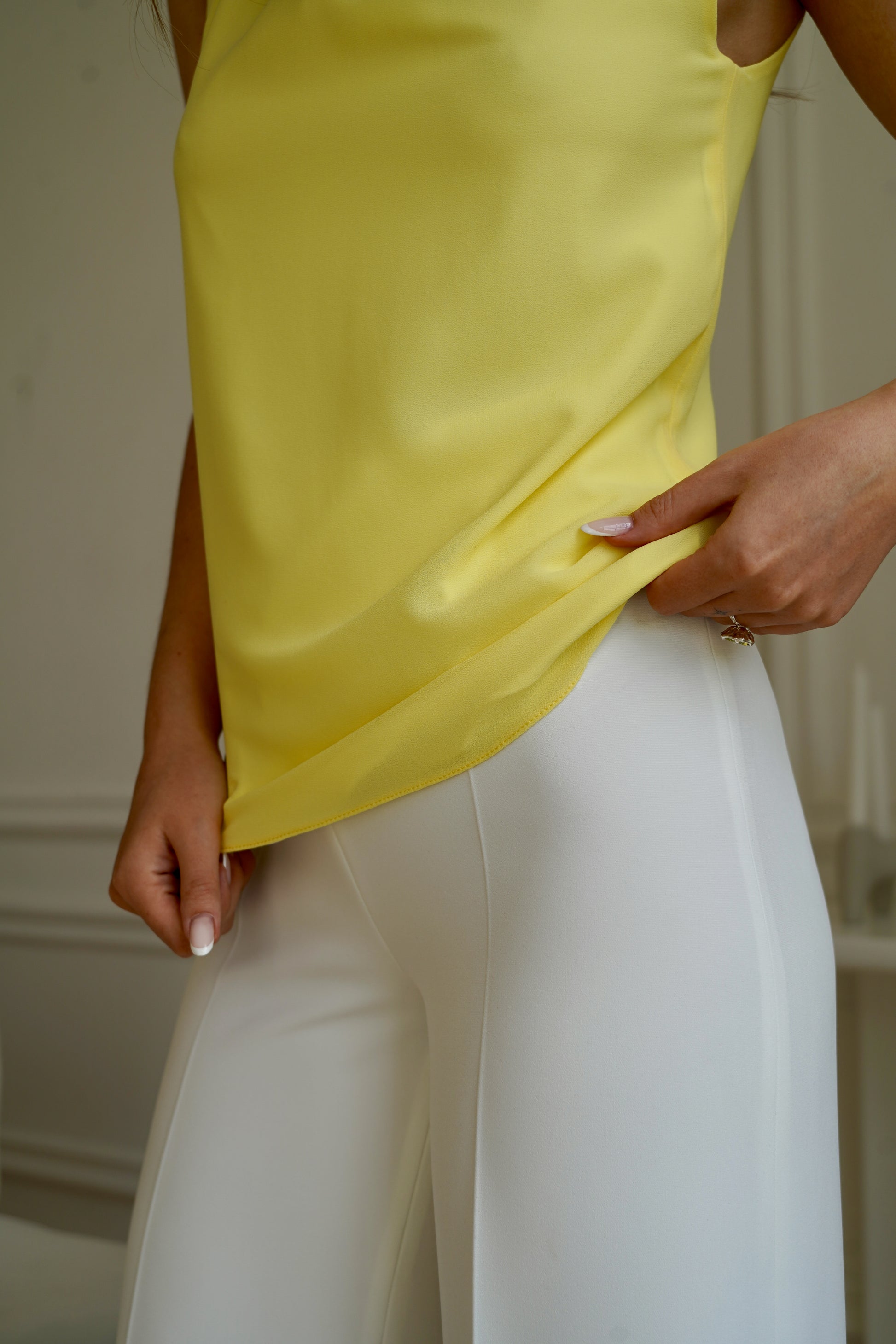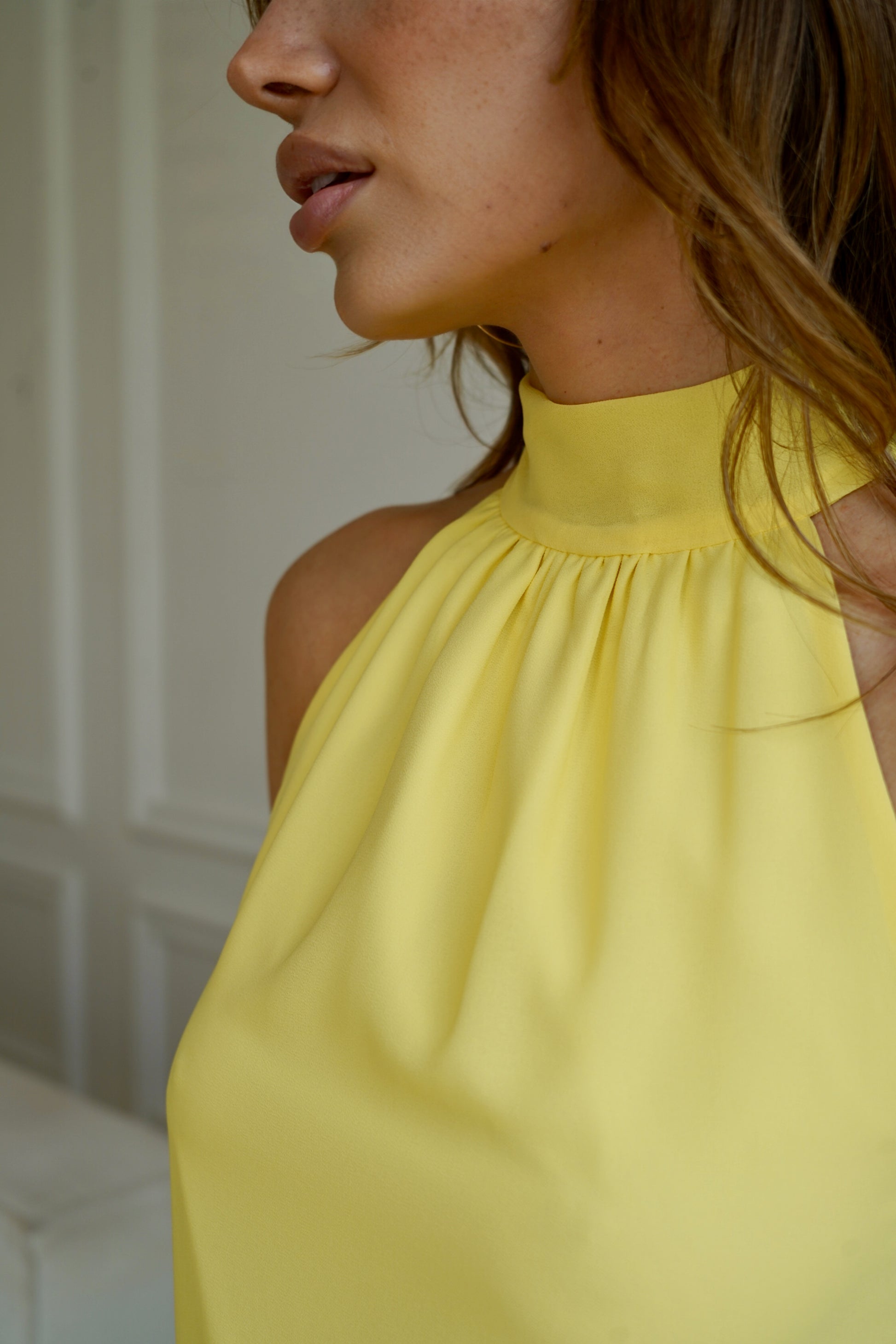 Цей стильний елемент гардеробу ідеально підходить для будь-якої нагоди, додаючи яскравості та жіночності вашому образу. Зав'язки на шиї створюють витончений акцент, дозволяючи вам регулювати посадку та стиль. Легка текстура тканини дарує комфорт протягом усього дня, а насичений жовтий колір підкреслює вашу індивідуальність. Поєднуйте цю блузу з джинсами або спідницею, щоб створити бездоганний вигляд для роботи або вечірки.