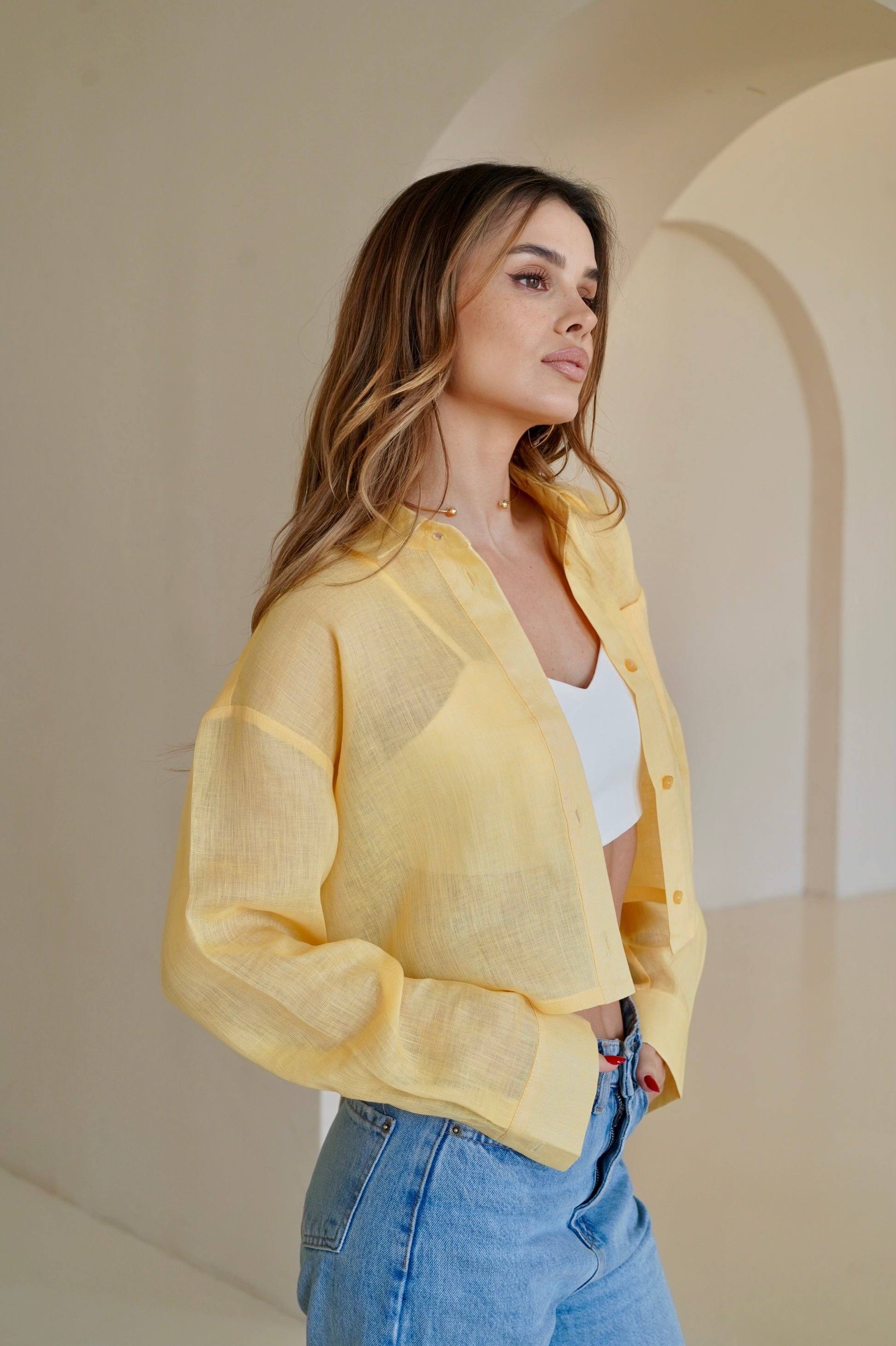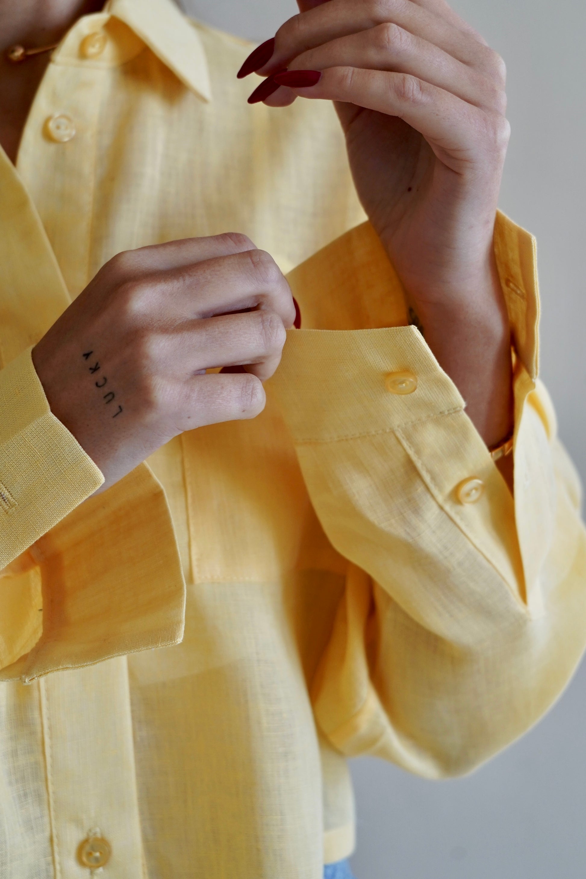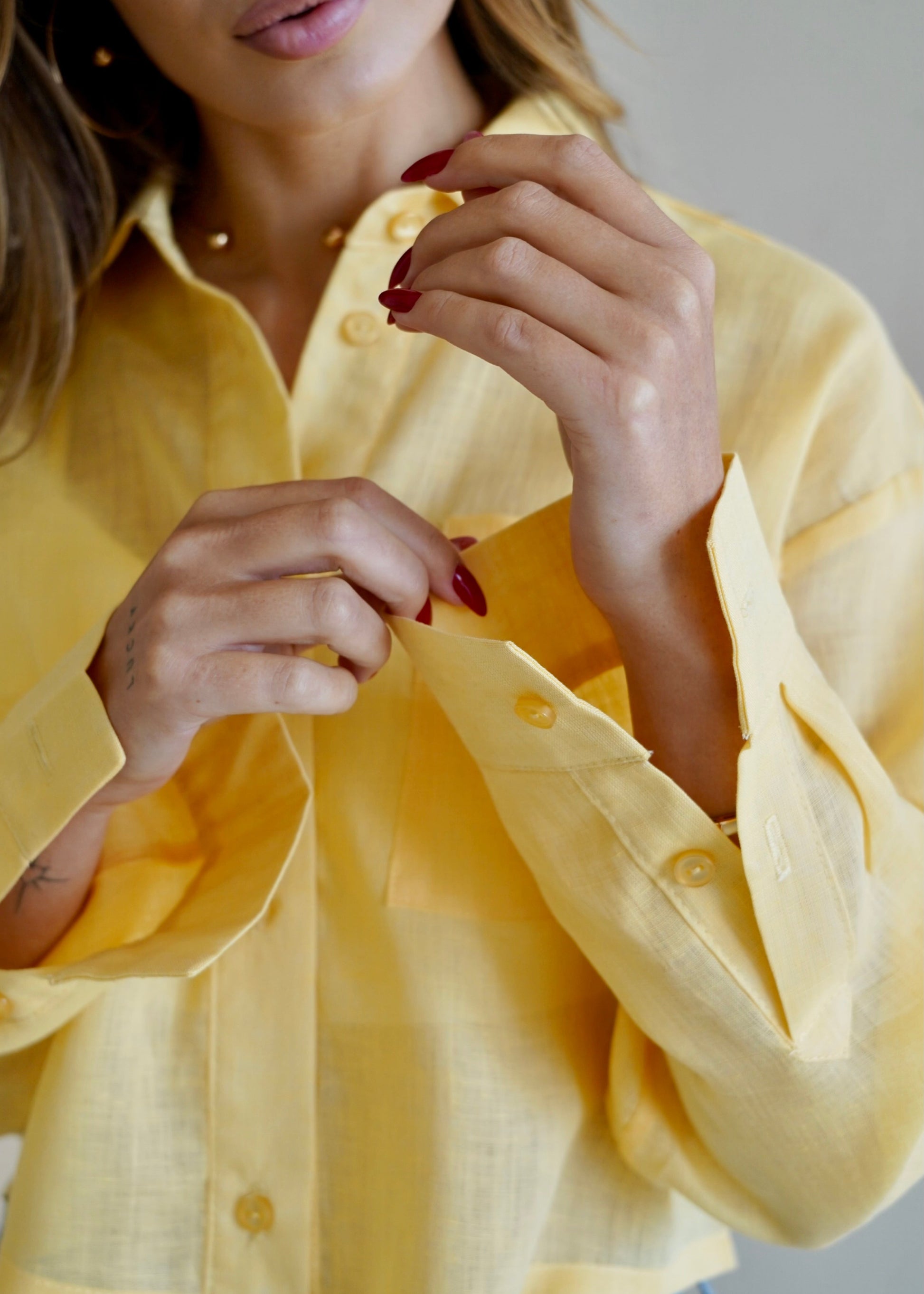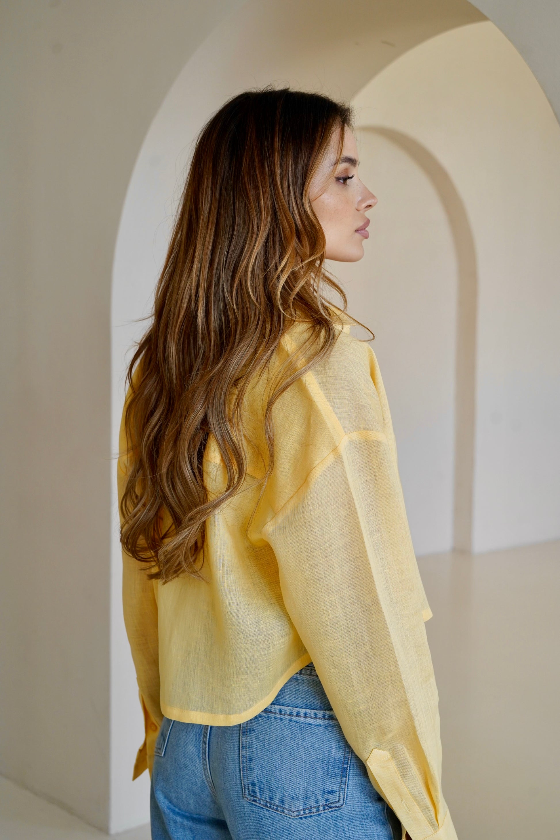 Оверсайз рубашка ніжного жовтого кольору, виготовлена з натурального італійського стокового льону найвищої якості! Цей матеріал забезпечує чудову повітропроникність, комфорт та легкість, що робить її ідеальним вибором для спекотних днів.