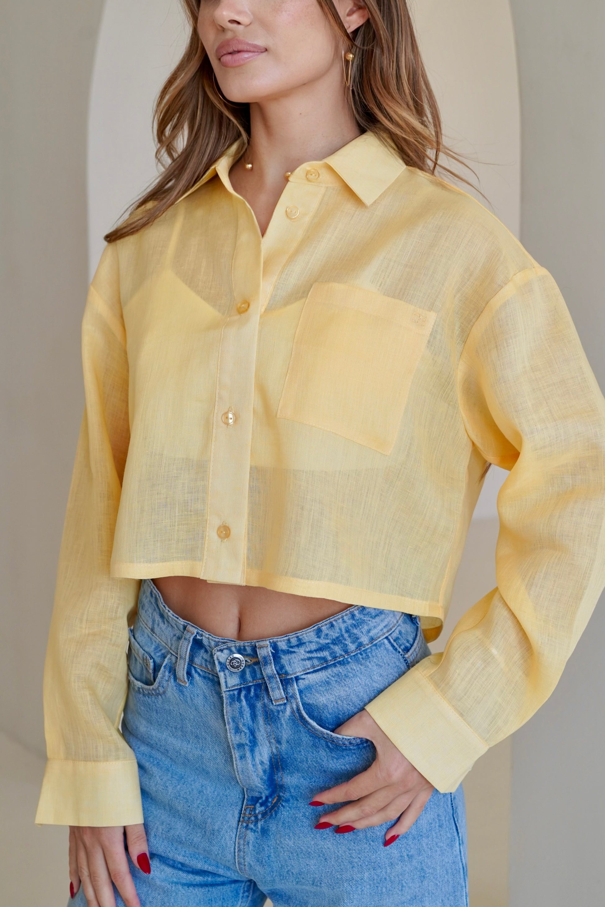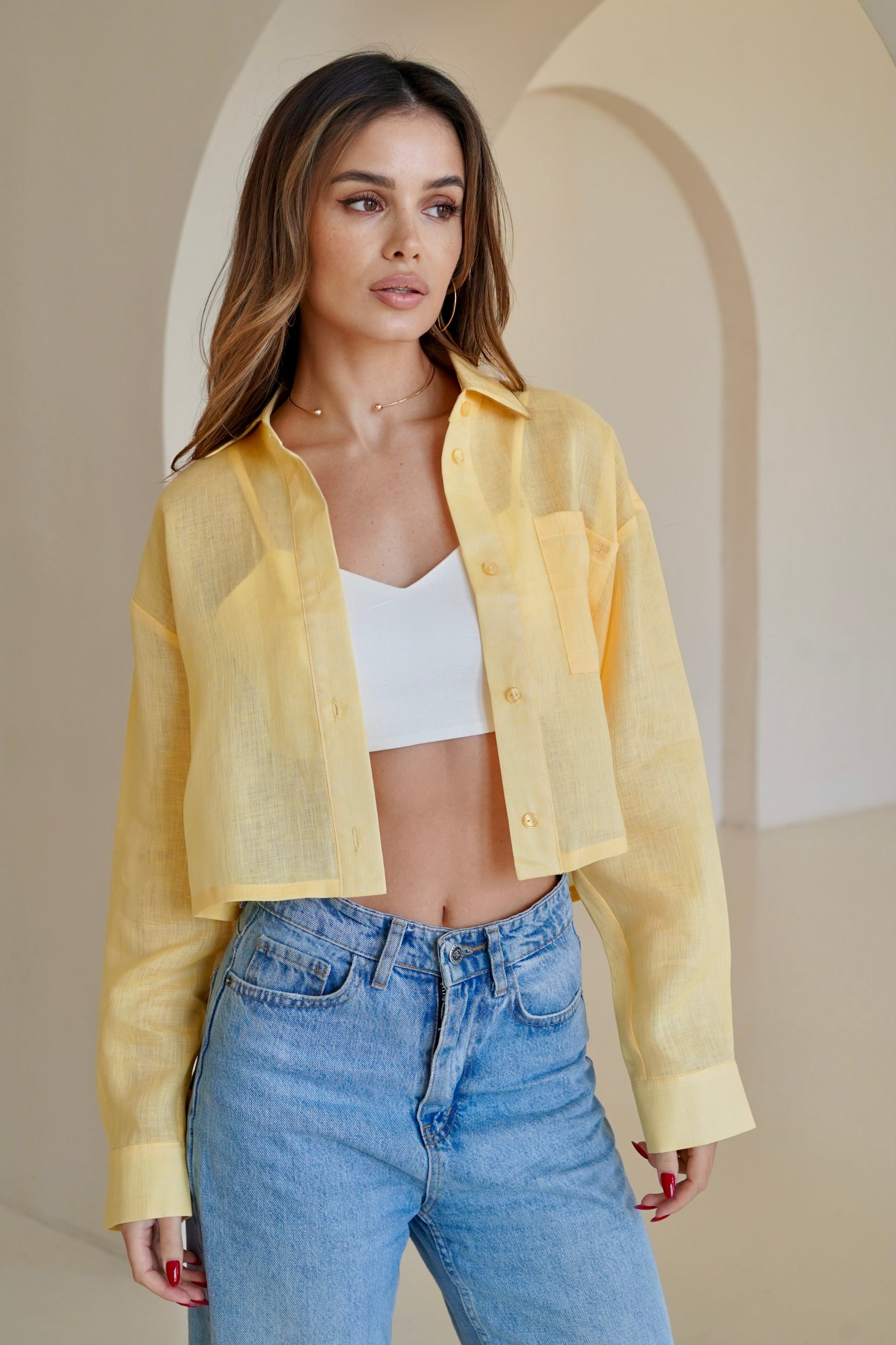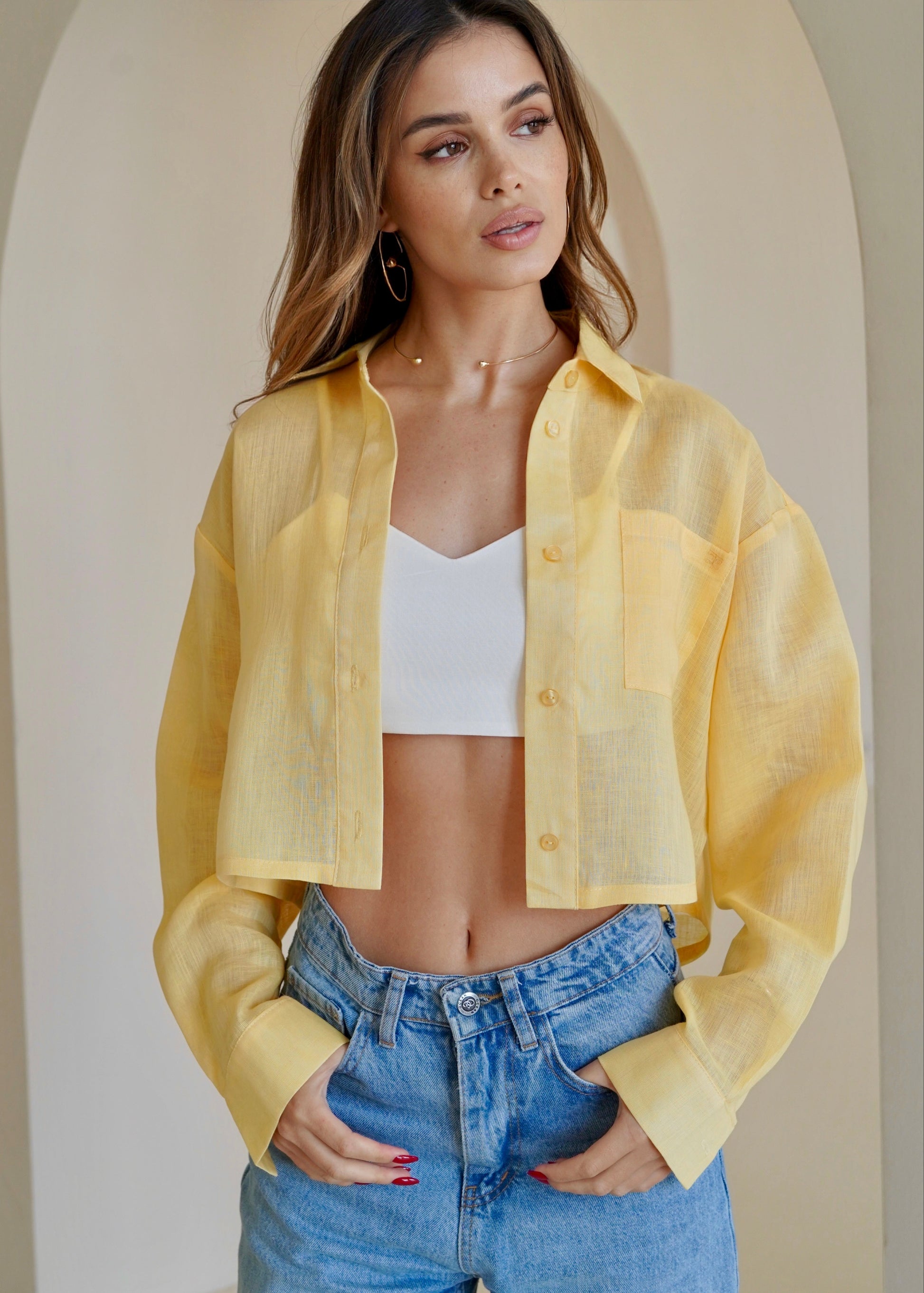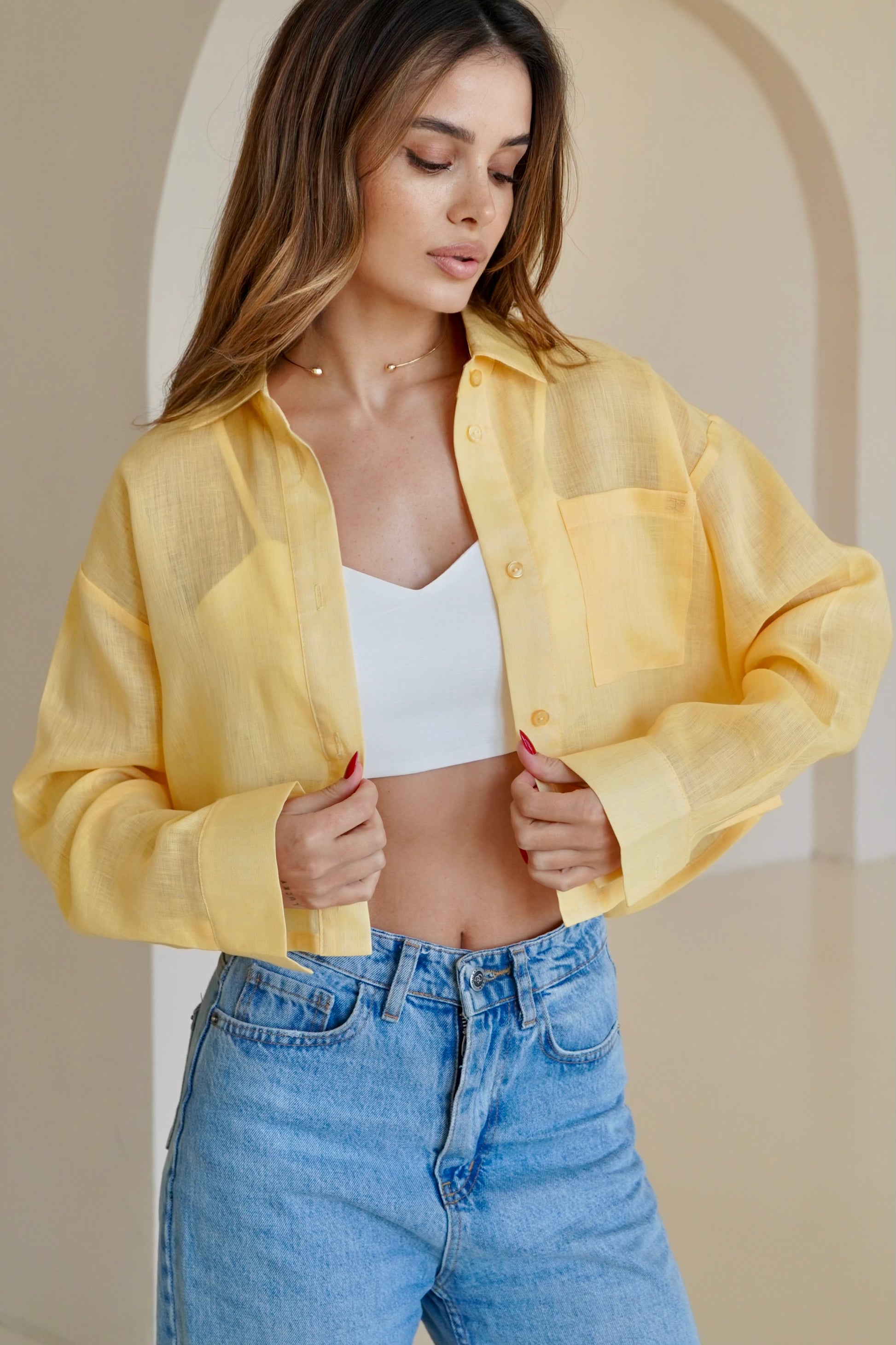Оверсайз рубашка ніжного жовтого кольору, виготовлена з натурального італійського стокового льону найвищої якості! Цей матеріал забезпечує чудову повітропроникність, комфорт та легкість, що робить її ідеальним вибором для спекотних днів.